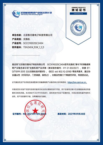 2021年9月,北京智芯微電子科技有限公司研發(fā)的TSN交換機在互聯(lián)網(wǎng)與工業(yè)融合創(chuàng)新工信部重點實驗室順利通過“TSN產(chǎn)業(yè)鏈名錄計劃”產(chǎn)品測試,獲得交換機類測試證書,成為第一批加入產(chǎn)業(yè)鏈名錄計劃的產(chǎn)品,2023年6月,同系列交換芯片也順利通過產(chǎn)品評測,獲得芯片模組類測試證書,成功加入TSN產(chǎn)業(yè)鏈名錄。