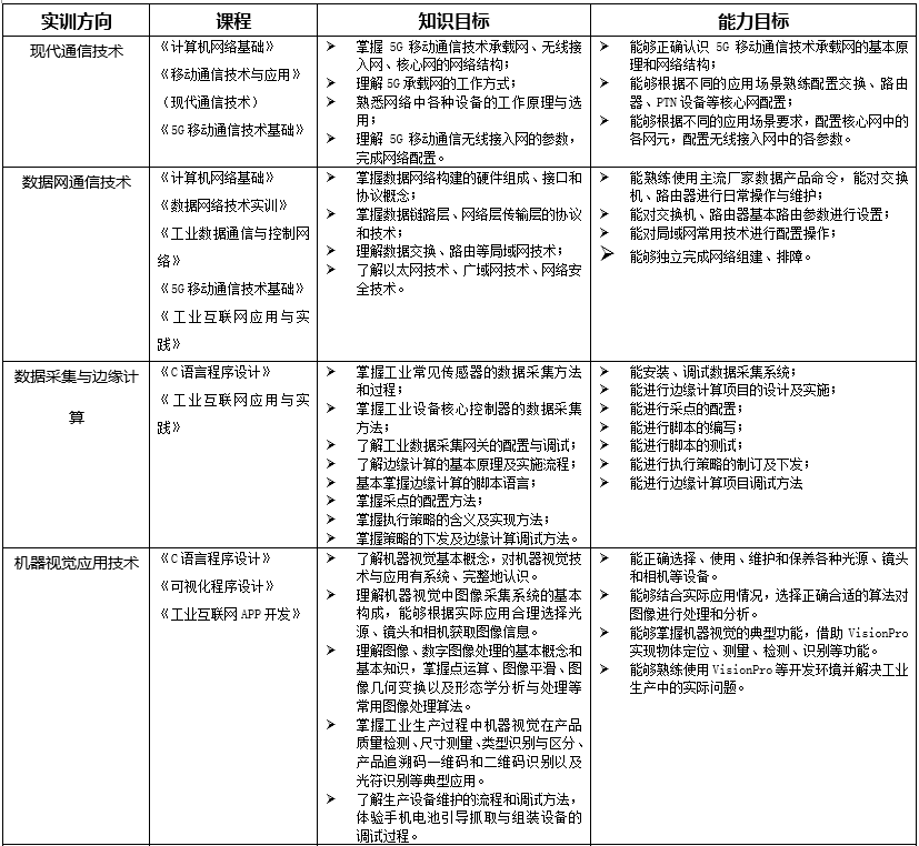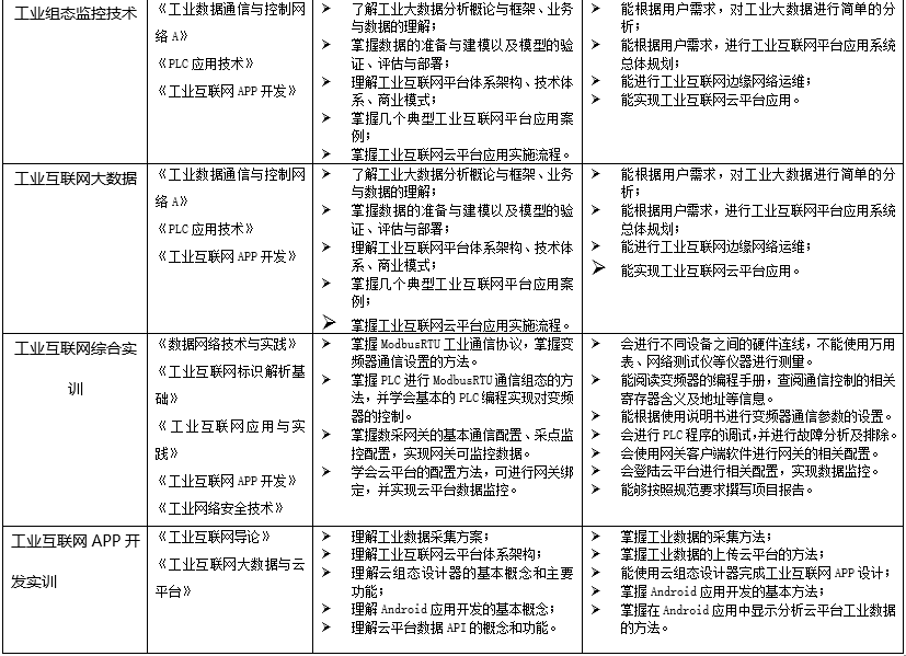 1、校內(nèi)低年級學(xué)生專業(yè)化培養(yǎng)根據(jù)“工業(yè)互聯(lián)網(wǎng)技術(shù)”專業(yè)人才培養(yǎng)方案,以專業(yè)基礎(chǔ)知識(shí)、技術(shù)、技能為主,培養(yǎng)具有扎實(shí)基礎(chǔ)與素養(yǎng)的專業(yè)人才。2、校內(nèi)高年級學(xué)生定向化培養(yǎng)根據(jù)當(dāng)前及預(yù)期就業(yè)需求,以熱門就業(yè)崗位所需技能為主,培訓(xùn)學(xué)生入職即上崗的專業(yè)技能。3、企業(yè)員工訂單式培養(yǎng)針對工業(yè)互聯(lián)網(wǎng)相關(guān)企業(yè)自有部分員工對本專業(yè)領(lǐng)域或?qū)I(yè)技術(shù)的不完全掌握,由企業(yè)自行提出需要培訓(xùn)的內(nèi)容,承接其培訓(xùn)工作。4、社會(huì)人員項(xiàng)目制培養(yǎng)針對無法由企業(yè)出面組織、或本人有意愿進(jìn)入工業(yè)互聯(lián)網(wǎng)領(lǐng)域的散裝社會(huì)人員,制定適合不同層次、不同崗位的實(shí)訓(xùn)項(xiàng)目,吸引其參加培訓(xùn)。5、國際化人才培養(yǎng)針對本校外籍留學(xué)生,以專業(yè)基礎(chǔ)知識(shí)與技能為主,結(jié)合其所在國家工業(yè)互聯(lián)網(wǎng)發(fā)展水平,設(shè)計(jì)實(shí)訓(xùn)項(xiàng)目。6、“1+X”技能證書培訓(xùn)與認(rèn)證針對具有拿證需求的人員,根據(jù)技能證書要求,進(jìn)行培訓(xùn)及考核。7、線上培訓(xùn)課程輻射其他地區(qū)整合蘇州本地的工業(yè)互聯(lián)網(wǎng)產(chǎn)業(yè)發(fā)展的經(jīng)驗(yàn)和技術(shù)積累,將其中具有代表性的內(nèi)容做成培訓(xùn)內(nèi)容,通過線上課程,傳播到其他城市和地區(qū),為工業(yè)互聯(lián)網(wǎng)技術(shù)的全面發(fā)展和普及做貢獻(xiàn)。