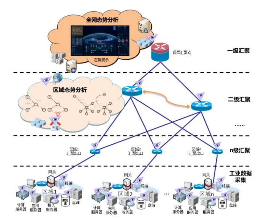 數(shù)據(jù)安全態(tài)勢(shì)感知如圖1所示,機(jī)理包括輕量級(jí)全網(wǎng)覆蓋的數(shù)據(jù)使用狀態(tài)采集、分層分級(jí)動(dòng)態(tài)匯集、數(shù)據(jù)安全區(qū)域態(tài)勢(shì)分析、數(shù)據(jù)安全全網(wǎng)態(tài)勢(shì)分析、態(tài)勢(shì)全景折疊可視化展示等部分(2)作用機(jī)理。