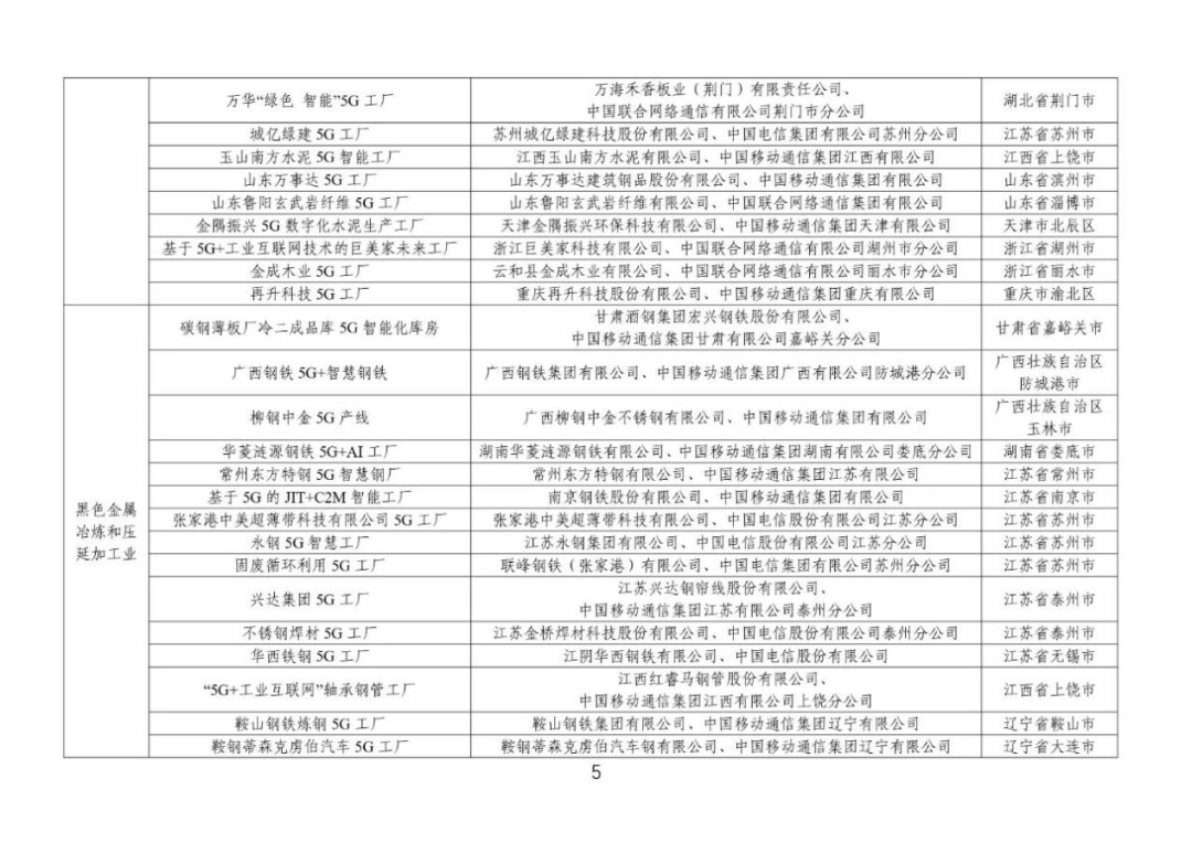 工業和信息化部信息通信管理局一級巡視員王鵬表示,目前全國“5G+工業互聯網”的項目數已經超過8000個,5G已經由生產現場監測、廠區智能物流等外圍輔助環節,深入到遠程設備操控、設備協同作業等核心控制環節。今年以來,工信部組織各地方積極推薦優秀項目,經過評審認定和社會公示形成了《2023年5G工廠目錄》。王鵬介紹,從行業分布來看,《2023年5G工廠名錄》中收錄的5G工廠已經廣泛覆蓋24個國民經濟大類。從地域分布來看,名錄中的5G工廠分布在全國26個省、區、市,其中江蘇、山東、湖北、安徽、浙江、江西、天津、河北、遼寧、湖南、廣東等省市的5G工廠數量位居全國前10位。從企業的類型來看,名錄收錄了中央企業、國有企業、民營企業、外資企業、合資企業等各類市場主體,其中大型企業占比達到52.7%,中小企業也達到了47.3%,已經形成大中小企業協同推進的良好局面。從場景實踐來看,工信部前期已經發布過“5G+工業互聯網”20大典型場景,樹立了一批“樣板間”,而在名錄中的300個5G工廠中,20個典型應用場景的實踐均超過50%,形成了“商品房”的示范推廣效應。從發展成效來看,據工業互聯網產業聯盟根據名錄當中企業報送的數據來測算,300個5G工廠將帶動總投資近百億元,對企業提質降本增效、綠色安全發展等方面的促進作用明顯。根據工業互聯網產業聯盟通過“5G工廠種子項目”統計,截至今年9月,全國已有1800余個5G工廠項目,涉及29個省(區、市),已覆蓋裝備制造、電子設備制造、石化化工、港口等10個“5G+工業互聯網”重點行業,以及有色金屬、材料等其他行業,項目類型已包含產線、車間、工廠等各層級。