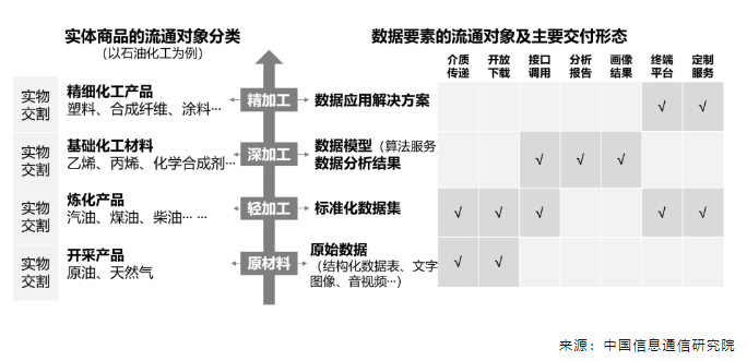 答:從流通對象來看,流通中的數(shù)據(jù)包括從原料到衍生服務的多種形態(tài)(如圖1)。就產(chǎn)品形態(tài)而言,流通中的數(shù)據(jù)產(chǎn)品可以參照實體商品的加工程度來進行區(qū)分。類比石油化工領域,原油、天然氣等是一經(jīng)開采即可得到的原材料,在此基礎上進行不同程度的煉化和加工得到不同類型的下游消費產(chǎn)品,一類如汽油、煤油等成品油,是對原材料進行煉化得到的輕加工產(chǎn)品;一類如乙烯、丙烯等基礎化工材料是煉化后經(jīng)裂解得到的深加工產(chǎn)品;一類如塑料、合成纖維等精細化工材料是對基礎化工材料進一步加工合成得到的精加工產(chǎn)品。相應地,在數(shù)據(jù)流通領域,原始數(shù)據(jù)、標準化數(shù)據(jù)集、數(shù)據(jù)模型或分析結果、數(shù)據(jù)應用解決方案可大致對應不同加工程度得到的數(shù)據(jù)產(chǎn)品和服務。