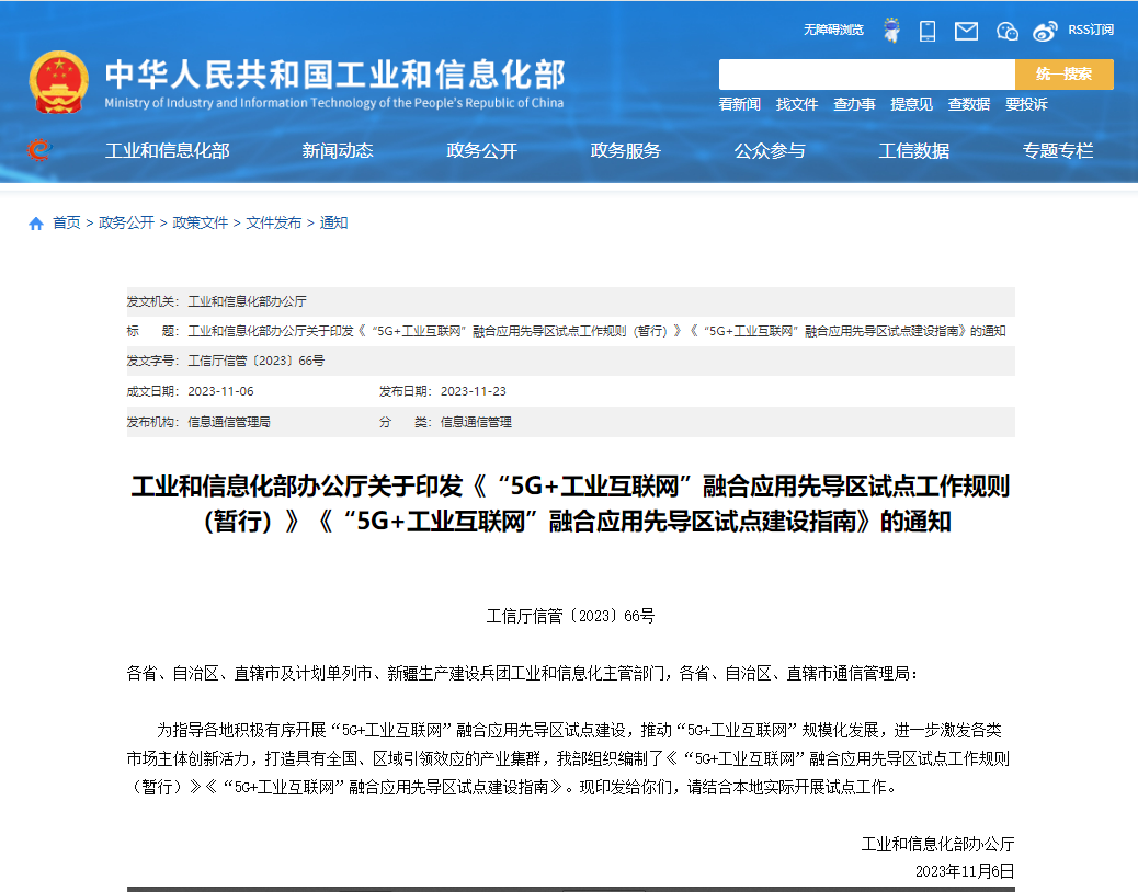 11月23日,工業和信息化部印發《“5G+工業互聯網”融合應用先導區試點工作規則(暫行)》《“5G+工業互聯網”融合應用先導區試點建設指南》,深入實施工業互聯網創新發展戰略,加強“5G+工業互聯網”融合應用先導區試點管理工作,發揮先導區試點引領帶動效應,促進“5G+工業互聯網”規模化發展。