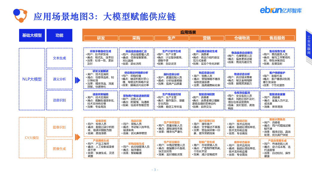技術(shù)賦能圖示例:億邦智庫(kù)梳理的大模型賦能供應(yīng)鏈的應(yīng)用場(chǎng)景地圖以大模型技術(shù)和供應(yīng)鏈環(huán)節(jié)兩個(gè)維度展開,助力大模型供應(yīng)商向鏈主企業(yè)、或供應(yīng)鏈平臺(tái)等,一圖展示全景服務(wù)能力,客戶方一圖通覽全局,按圖選擇切入點(diǎn)。