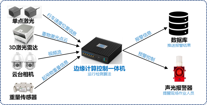 重物起吊是車間中最常見的高風險作業場景,東方研究院基于EC13211研發了重物起吊作業安全預警系統,控制器安裝于行車上,就近接入單點激光、3D激光雷達、工業攝像頭和其他傳感器,進行實時的數據采集、姿態感知和AI視覺處理,具有較高的檢測實時性。系統可在起吊作業過程中對吊運物下方站人和吊運物前進方向有人等安全風險進行智能識別與安全預警,提醒行車駕駛員及時停止作業,并上傳報警信息。該系統集起吊作業監控、風險預警、違規報警于一體,極大地降低了重物起吊作業中的安全風險。