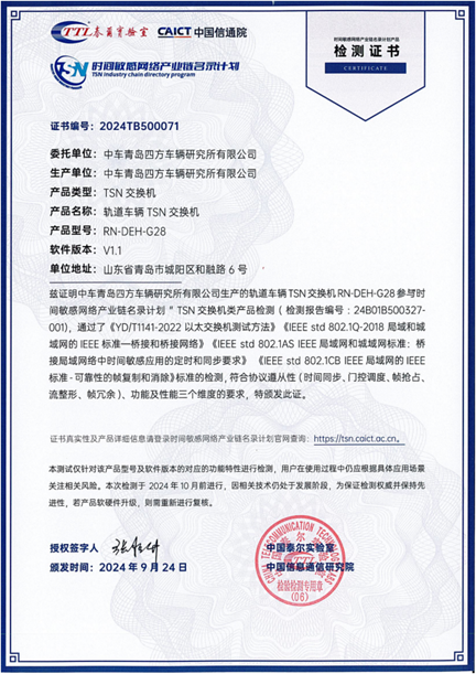 2024年9月,中車青島四方車輛研究所有限公司(以下簡稱中車四方所)研發(fā)的RN-DEH-G28型軌道車輛TSN交換機(jī),在互聯(lián)網(wǎng)與工業(yè)融合創(chuàng)新工信部重點(diǎn)實(shí)驗室順利通過名錄計劃產(chǎn)品評測,獲得交換機(jī)類檢測證書。
