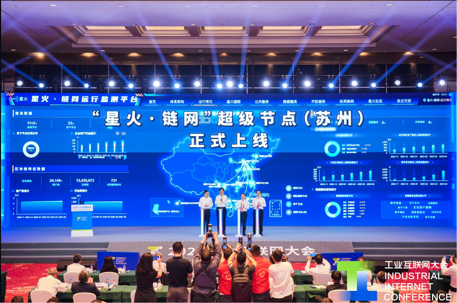 在2025工業互聯網大會開幕式上,“星火·鏈網”超級節點(蘇州)正式上線。江蘇省工業和信息化廳黨組書記、廳長朱愛勛,江蘇省通信管理局黨組書記、局長許繼金,蘇州市政協副主席、吳中區委書記丁立新,中國信息通信研究院院長余曉暉參與上線儀式。