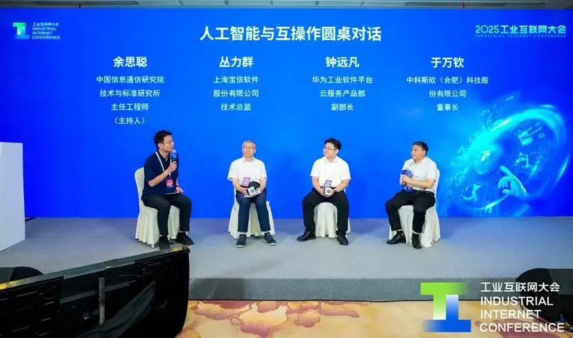 在圓桌對話環節,中國信息通信研究院技術與標準研究所主任工程師余思聰、上海寶信股份有限公司技術總監叢力群、華為工業軟件平臺云服務產品部副部長鐘遠凡、中科斯歐(合肥)科技股份有限公司董事長于萬欽就工業互聯網與人工智能的融合路徑、數據治理挑戰以及AI時代工業智能化發展策略等熱點話題進行了探討。