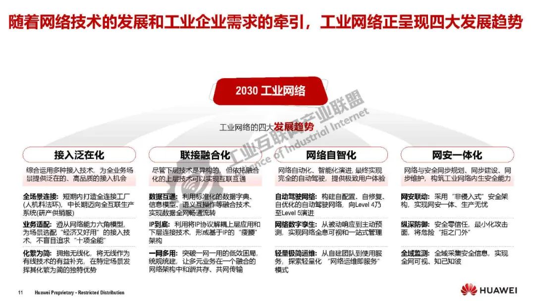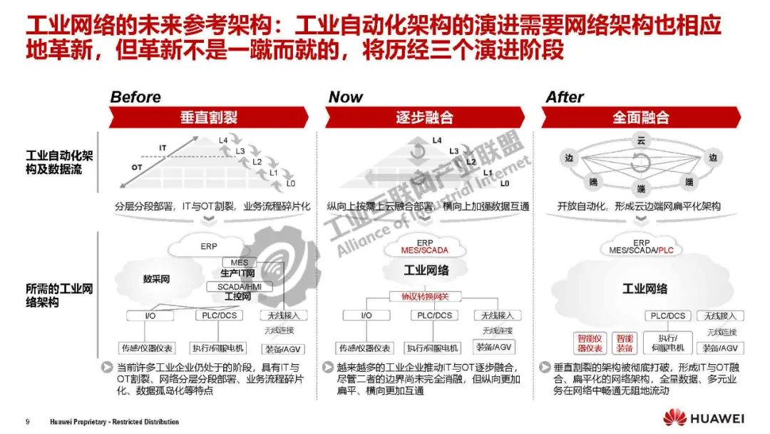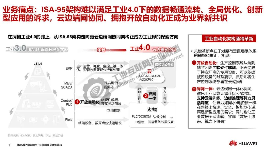 關鍵革新點在于對原有垂直層級體系的解構和重組,實現: ①開放自動化:生產控制系統從端到端耦合封閉走向分層解耦、開放通用,不再受限于特定廠商的專用設備,可靈活地將生產控制系統部署在云/邊/端。②算網一體:云邊端網一體化協同,依托工業網絡無縫連接云/邊/端, 支持云端訓練,邊緣推理等算力靈活調度,讓算力如同水/電資源一樣在網絡上快速、安全、智能地傳遞,滿足新型應用的需求;同時也讓工業數據全網流轉,實現“數據上得來,算力下得去”。