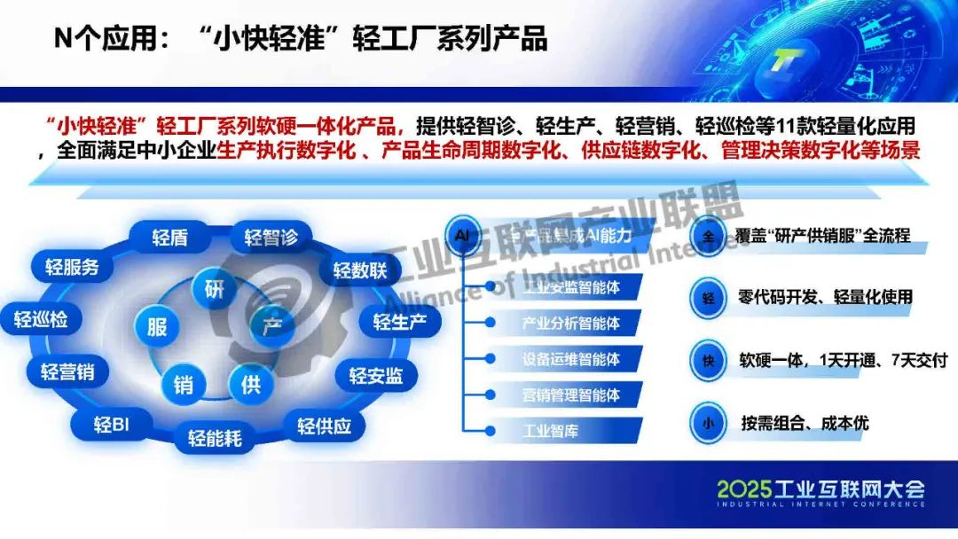 “小快輕準(zhǔn)”輕工廠系列軟硬一體化產(chǎn)品,提供輕智診、輕生產(chǎn)、輕營(yíng)銷(xiāo)、輕巡檢等11款輕量化應(yīng)用,全面滿(mǎn)足中小企業(yè)生產(chǎn)執(zhí)行數(shù)字化 、產(chǎn)品生命周期數(shù)字化、供應(yīng)鏈數(shù)字化、管理決策數(shù)字化等場(chǎng)景