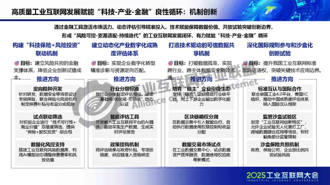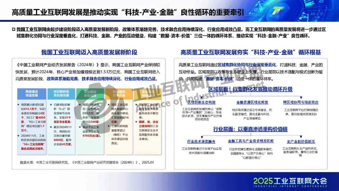廖文凱介紹,我國工業互聯網由起步建設階段邁入高質量發展新階段,政策體系漸趨完善、技術融合應用持續深化、行業應用成效凸顯。而工業互聯網的高質量發展將進一步通過區域集群化協同與行業深度垂直化,打通科技、金融、產業的互動壁壘,構建“數據-資本-價值”三位一體的循環體系,推動實現“科技-金融-產業”良性循環。