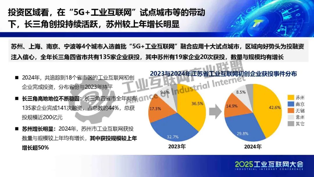 肖榮美介紹,近期,引導(dǎo)金融支持工業(yè)互聯(lián)網(wǎng)的政策導(dǎo)向更加清晰,釋放積極的行業(yè)信號(hào)。圍繞政策部署、公共服務(wù)等方面,政府層面開展了一系列推動(dòng)工業(yè)互聯(lián)網(wǎng)產(chǎn)融合作的工作部署。工業(yè)互聯(lián)網(wǎng)上市企業(yè)逆勢(shì)擴(kuò)容,呈現(xiàn)出“穩(wěn)”的增長趨勢(shì);初創(chuàng)企業(yè)融資回暖,“智”的特征突出;投資主體看,“國家隊(duì)”“大廠”紛紛下場,促進(jìn)實(shí)數(shù)深度融合。投資區(qū)域看,在“5G+工業(yè)互聯(lián)網(wǎng)”試點(diǎn)城市等的帶動(dòng)下,長三角創(chuàng)投持續(xù)活躍,蘇州較上年增長明顯。