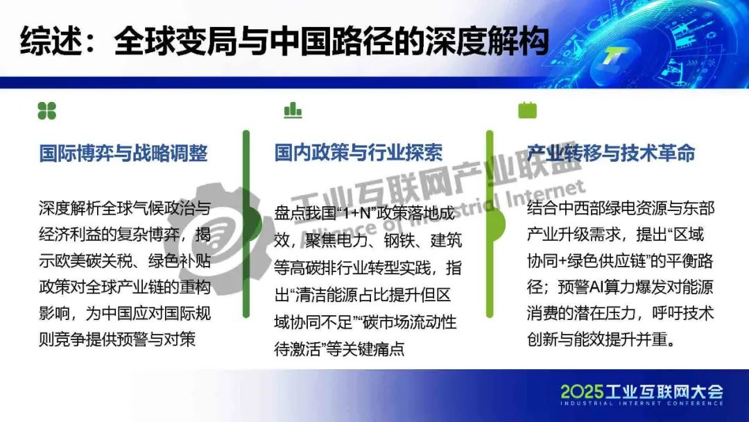 全球變局與中國路徑的深度解構(gòu):一是深度解析全球氣候政治與經(jīng)濟(jì)利益的復(fù)雜博弈,揭示歐美碳關(guān)稅、綠色補貼政策對全球產(chǎn)業(yè)鏈的重構(gòu)影響,為中國應(yīng)對國際規(guī)則競爭提供預(yù)警與對策;二是盤點我國“1+N”政策落地成效,聚焦電力、鋼鐵、建筑等高碳排行業(yè)轉(zhuǎn)型實踐,指出“清潔能源占比提升但區(qū)域協(xié)同不足”“碳市場流動性待激活”等關(guān)鍵痛點;三是結(jié)合中西部綠電資源與東部產(chǎn)業(yè)升級需求,提出“區(qū)域協(xié)同+綠色供應(yīng)鏈”的平衡路徑;預(yù)警AI算力爆發(fā)對能源消費的潛在壓力,呼吁技術(shù)創(chuàng)新與能效提升并重。