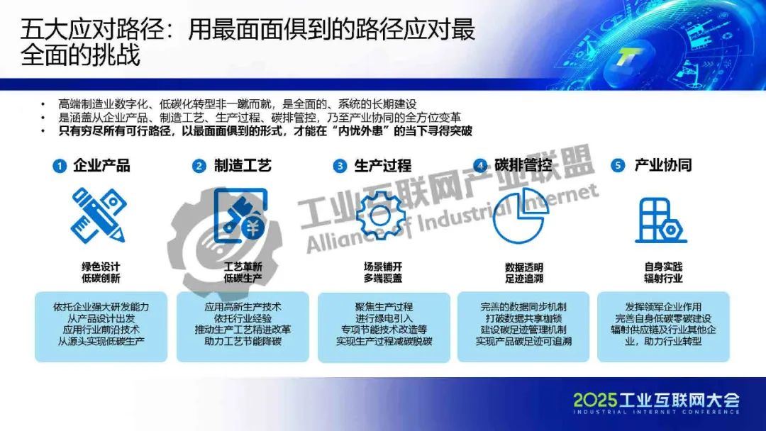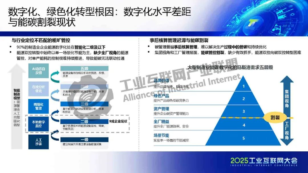 王輝介紹,中國高端制造業在數字化與綠色化協同轉型中面臨內憂外患:國內政策約束、國際碳壁壘、行業降本壓力及龍頭競爭倒逼。當前能碳管理粗放,數字化水平普遍偏低,且存在“能碳割裂”問題,能源與碳管理分屬不同部門,數據協同困難。轉型路徑聚焦綠色產品創新、核心工藝節能、端到端能源精細化管理、碳雙控拉通及產業鏈協同等五大方向。實踐案例顯示,通過AI+數字化工具優化供應鏈、光儲充集成及工藝革新,單產能耗可降40%,碳稅轉為碳資產收益。未來需打破組織壁壘,以數據驅動實現能碳一體化,推動高端制造業綠色競爭力升級。