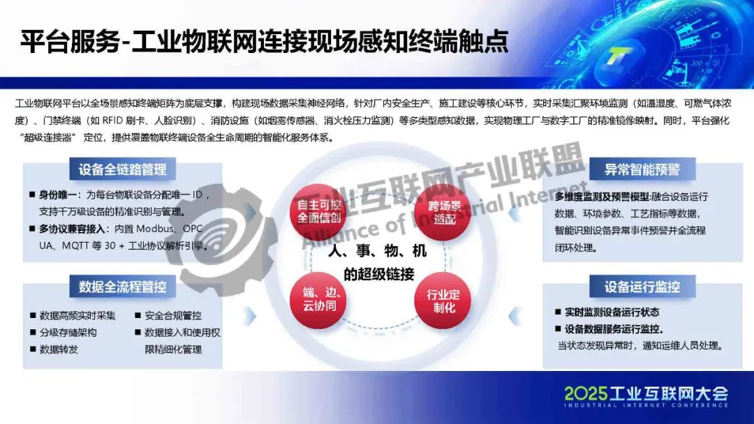 工業(yè)物聯(lián)網(wǎng)平臺(tái)以全場(chǎng)景感知終端矩陣為底層支撐,構(gòu)建現(xiàn)場(chǎng)數(shù)據(jù)采集神經(jīng)網(wǎng)絡(luò),針對(duì)廠內(nèi)安全生產(chǎn)、施工建設(shè)等核心環(huán)節(jié),實(shí)時(shí)采集匯聚環(huán)境監(jiān)測(cè)、門禁終端、消防設(shè)施等多類型感知數(shù)據(jù),實(shí)現(xiàn)物理工廠與數(shù)字工廠的精準(zhǔn)鏡像映射。同時(shí),平臺(tái)強(qiáng)化 “超級(jí)連接器” 定位,提供覆蓋物聯(lián)終端設(shè)備全生命周期的智能化服務(wù)體系。