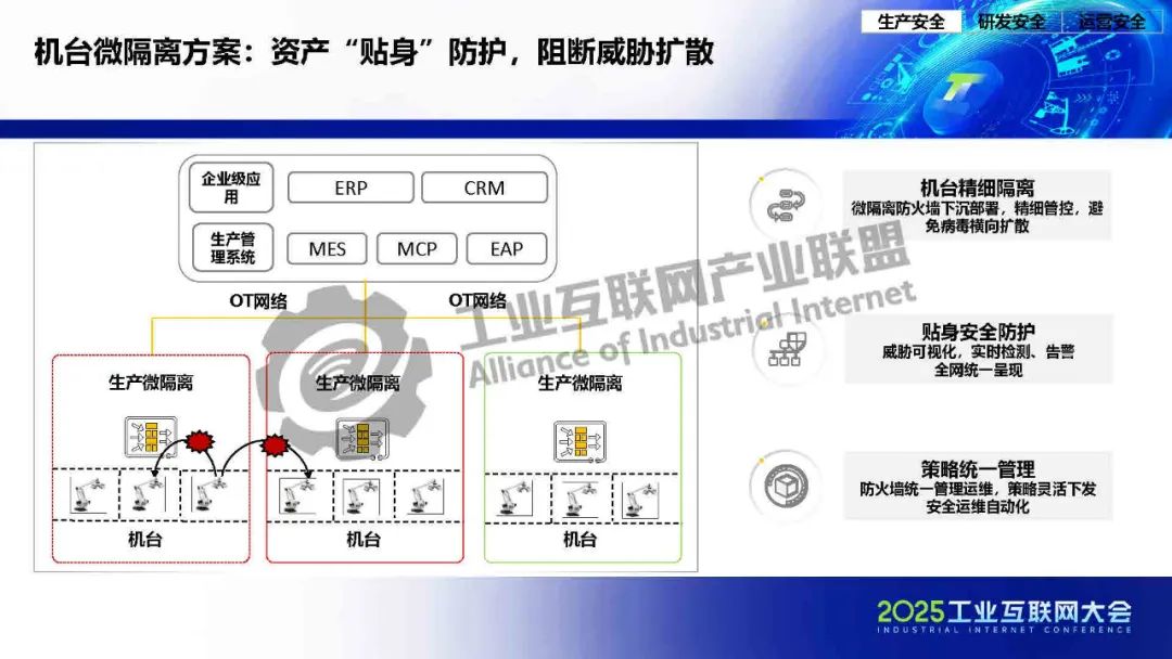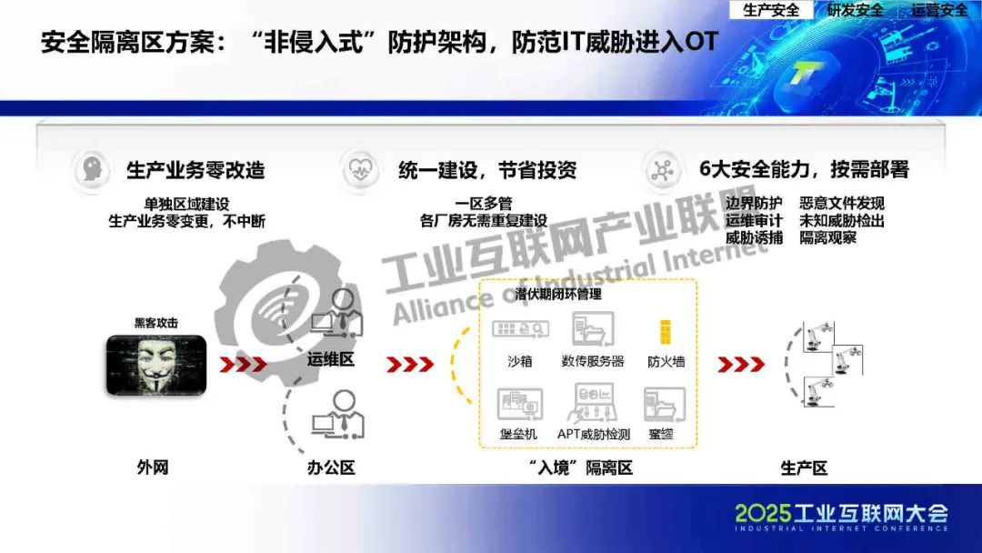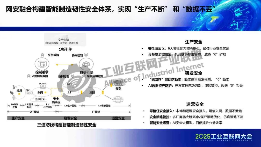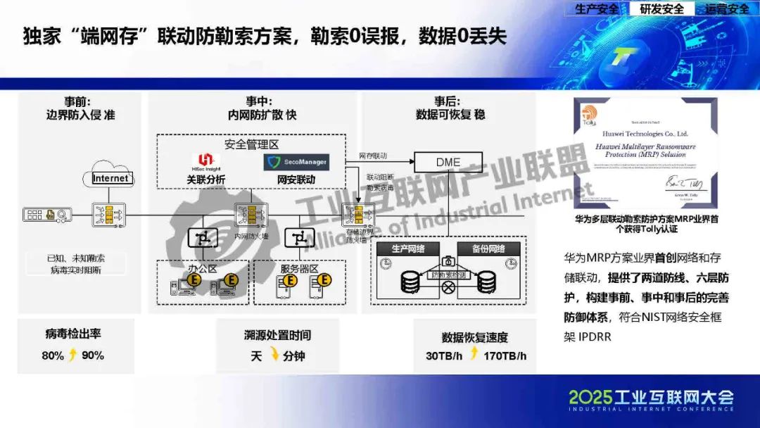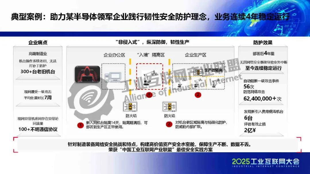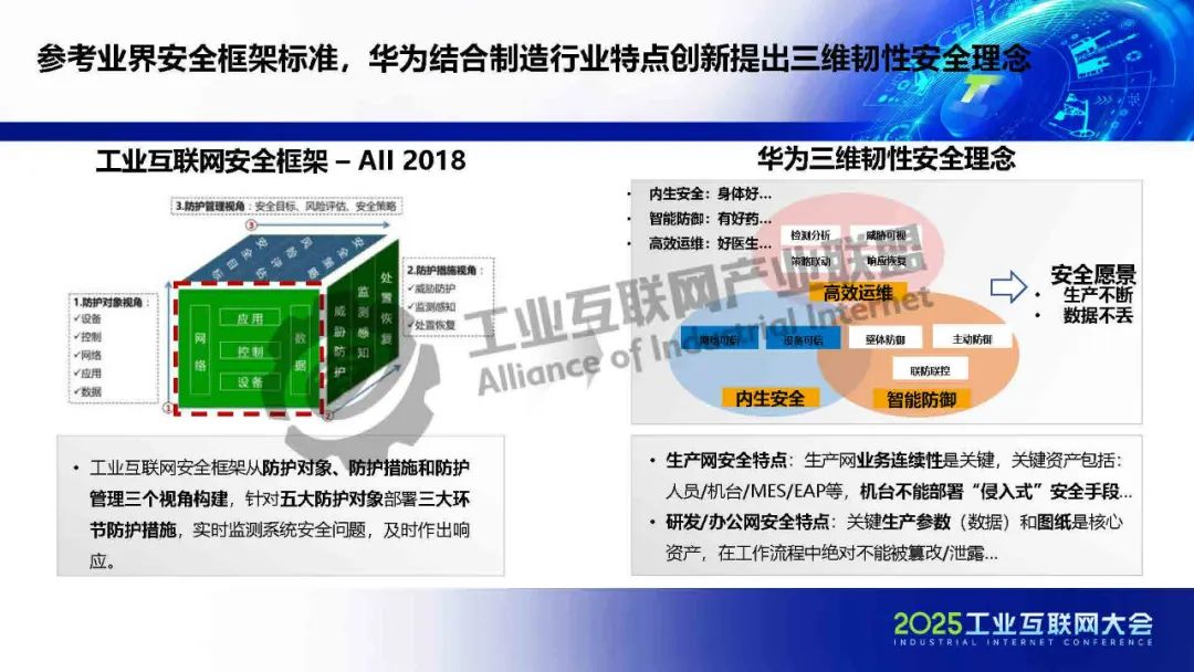 張光明介紹,參考業(yè)界安全框架標(biāo)準(zhǔn),華為結(jié)合制造行業(yè)特點(diǎn)創(chuàng)新提出三維韌性安全理念。該理念通過內(nèi)生安全、智能防御和高效運(yùn)維,結(jié)合檢測分析、威脅可視、策略聯(lián)動和響應(yīng)恢復(fù),采用全流程可信設(shè)計(jì),關(guān)鍵器件100%國產(chǎn)化,達(dá)到非侵入式安全隔離區(qū)實(shí)現(xiàn)IT/OT隔離、機(jī)臺微隔離阻斷橫向威脅擴(kuò)散、業(yè)界首創(chuàng)"端網(wǎng)存"聯(lián)動防勒索方案、零信任動態(tài)授權(quán)確保安全接入、AI大模型提升安全運(yùn)營效率160倍等效果,已助力某半導(dǎo)體企業(yè)實(shí)現(xiàn)4年業(yè)務(wù)零中斷,累計(jì)防御攻擊超6240萬次。華為方案獲得Gartner等權(quán)威機(jī)構(gòu)認(rèn)可,實(shí)現(xiàn)"生產(chǎn)不斷、數(shù)據(jù)不丟"的安全目標(biāo)。