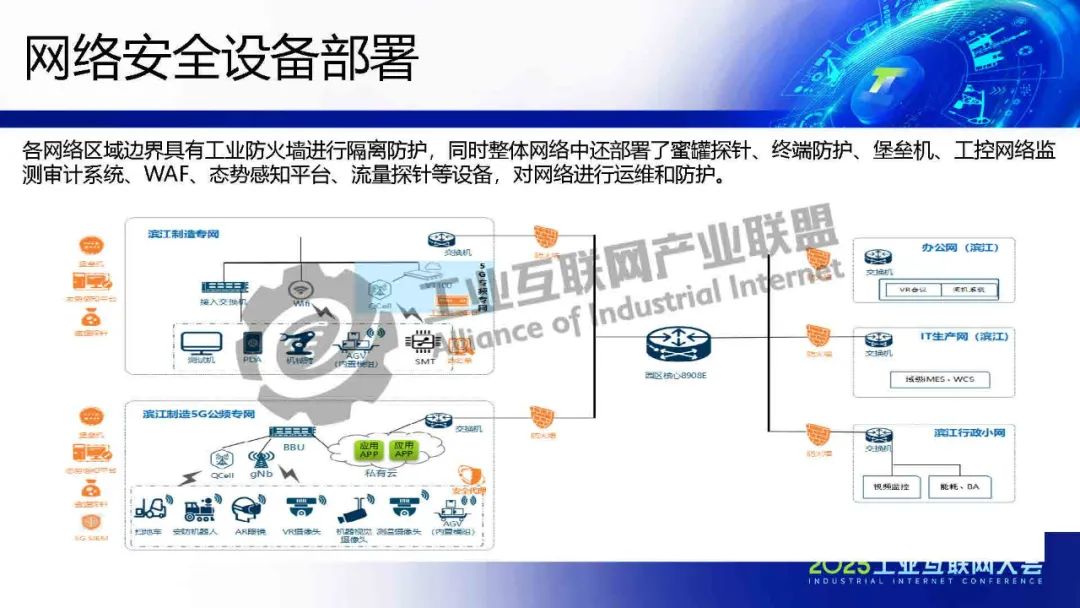 郝振武介紹,中興通訊南京濱江智能制造基地是首個信通院認證的五星5G工廠。基地整體網絡結構劃分為辦公網、IT 生產網、濱江行政小網、濱江制造專網、濱江制造5G公頻專網等,其中制造專網中具有5G專頻專網用于現場生產,非常具有典型意義。網絡遵循網絡安全等級保護的要求,按照“一個中心三重防護"設計,在5G公頻專網部署了防火墻、堡壘機、態勢感知、蜜罐等防護措施,在5G專頻專網部署了工控防火墻、工控網絡監測審計系統,保證了網絡的安全運行。基地通過了工業網絡與數據安全中心的工業互聯網企業網絡安全分類分級增強級評估,極大的提升網絡防護水平和安全治理效果。