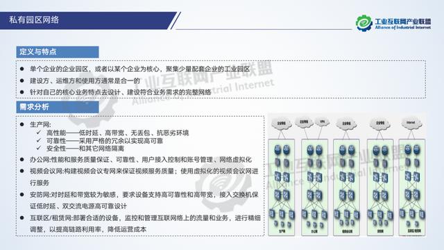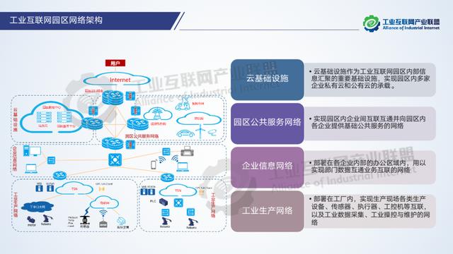 工業互聯網園區網絡是指在工業互聯網園區內部部署,實現園區企業設備互聯和信息互通的網絡基礎設施,是由廠區到園區、由生產到管理的綜合性基礎網絡體系。當前現有的園區網絡存在網絡架構層級割裂、寬帶性價比低、缺乏系統繼承性企業、標準不統一、缺乏安全保障體系等問題,園區網絡未來的目標是打造新“三通一平”工業園區,即通話、通網、通云、統一服務平臺:建設低延時、高可靠、廣覆蓋的工業互聯網網絡基礎設施;集合網絡、軟件、物聯網技術和服務,實現數據在工業各個環節的無縫傳遞;支撐形成實時感知、協同交互、智能反饋的生產模式;提升園區產業服務水平,提高服務的明確性、高效性、靈活性;建立開放、融合、創新的網絡服務體系。