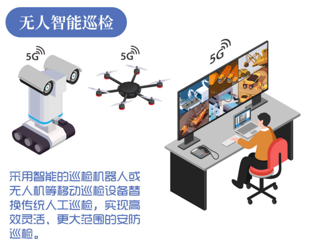 通過內(nèi)置 5G 模組或部署5G網(wǎng)關(guān)等設(shè)備,實(shí)現(xiàn)巡檢機(jī)器人或無人機(jī)等移動(dòng)化、智能化安防設(shè)備的5G網(wǎng)絡(luò)接入,替代巡檢人員進(jìn)行巡邏值守,采集現(xiàn)場(chǎng)視頻、語(yǔ)音、圖片等各項(xiàng)數(shù)據(jù),自動(dòng)完成檢測(cè)、巡航以及記錄數(shù)據(jù)、遠(yuǎn)程告警確認(rèn)等工作;相關(guān)數(shù)據(jù)通過5G 網(wǎng)絡(luò)實(shí)時(shí)回傳至智能巡檢系統(tǒng),智能巡檢系統(tǒng)利用圖像識(shí)別、深度學(xué)習(xí)等智能技術(shù)和算法處理,綜合判斷得出巡檢結(jié)果,有效提升安全等級(jí)、巡檢效率及安防效果。
