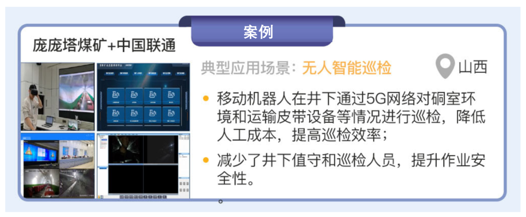 龐龐塔煤礦與中國(guó)聯(lián)通合作,在山西省開展“5G+智能礦山”項(xiàng)目建設(shè),實(shí)現(xiàn)了無人智能巡檢場(chǎng)景的應(yīng)用。項(xiàng)目在井下變電硐室和水泵房的排水、供電等設(shè)備遠(yuǎn)程集中監(jiān)控的基礎(chǔ)上,增加安裝 5G 模組的巡檢機(jī)器人,通過5G網(wǎng)絡(luò)進(jìn)行硐室 4K 高清視頻回傳、機(jī)器人監(jiān)測(cè)數(shù)據(jù)回傳和機(jī)器人實(shí)時(shí)控制,5G 技術(shù)支撐實(shí)現(xiàn)運(yùn)輸機(jī)、皮帶等設(shè)備的無人巡檢,降低運(yùn)輸環(huán)節(jié)的人工成本,提高巡檢效率,實(shí)現(xiàn)了井下固定崗位無人值守和無人巡檢,減少了井下作業(yè)人員,提升了作業(yè)安全性。