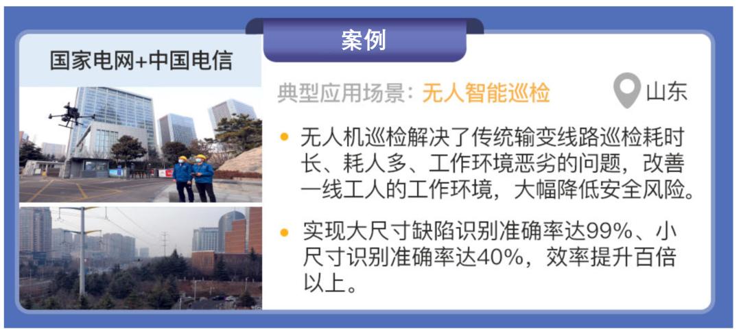國(guó)家電網(wǎng)與中國(guó)電信合作,在山東省青島市開展“5G+北斗智能巡檢無人機(jī)”項(xiàng)目建設(shè),實(shí)現(xiàn)了無人智能巡檢場(chǎng)景的應(yīng)用。項(xiàng)目新建 5G 獨(dú)立組網(wǎng)(SA)網(wǎng)絡(luò),完成了5G SA 專網(wǎng)的圖傳模塊的研發(fā),引入北斗服務(wù),實(shí)現(xiàn)無人機(jī)巡檢數(shù)據(jù)安全、實(shí)時(shí)、可靠回傳。解決了傳統(tǒng)輸變線路巡檢耗時(shí)長(zhǎng)、耗人多、工作環(huán)境惡劣的問題,改善一線工人的工作環(huán)境,大幅降低安全風(fēng)險(xiǎn)。同時(shí),采用圖像智能識(shí)別技術(shù),實(shí)現(xiàn)無人機(jī)自主巡檢、圖像實(shí)時(shí)傳輸、缺陷智能識(shí)別、輔助決策輸出等功能,解決了困擾無人機(jī)巡檢操作難、回傳難、分析難的問題,大尺寸缺陷識(shí)別準(zhǔn)確率達(dá)99%、小尺寸識(shí)別準(zhǔn)確率達(dá) 40%,工作效率提升百倍以上。