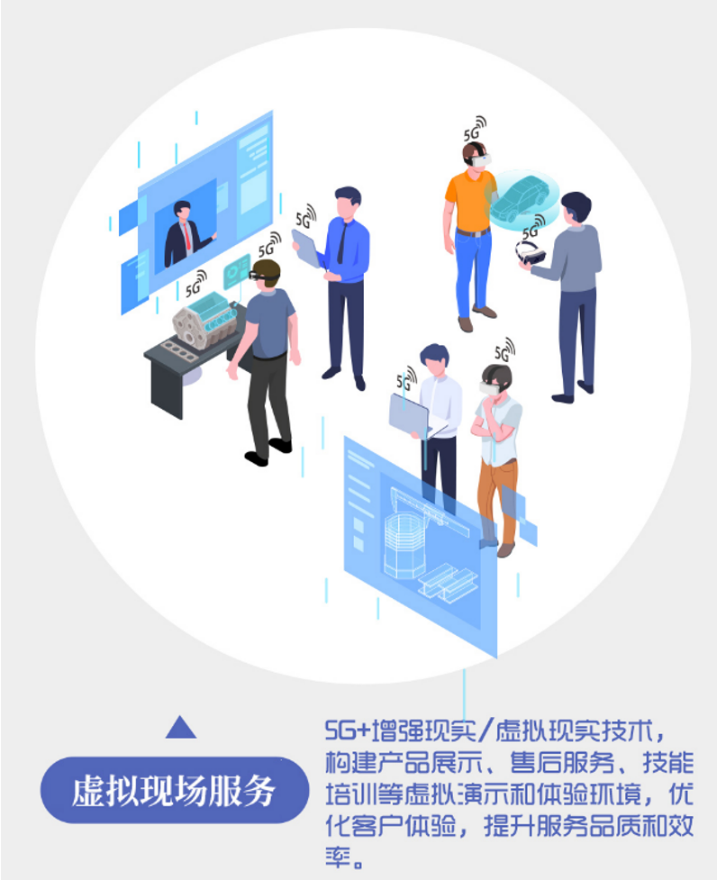 虛擬現(xiàn)場服務主要包括產(chǎn)品展示體驗、輔助技能學習、遠程運維指導等三類服務。產(chǎn)品展示體驗服務通過對工業(yè)產(chǎn)品的外型數(shù)據(jù)及內(nèi)部結構進行立體化建模,構建虛擬數(shù)字展廳,通過5G網(wǎng)絡傳輸至平板電腦、增強現(xiàn)實/虛擬現(xiàn)實(AR/VR)眼鏡等智能終端,與數(shù)字模型實時互動,實現(xiàn)產(chǎn)品細節(jié)的沉浸式體驗和感受。輔助技能學習服務基于5G和AR/VR融合構建貼近真實場景的全虛擬場景,進行操作技能培訓和自由操作練習,提高技能學習效率。遠程運維指導服務通過在全虛擬場景中,疊加遠端專家指導數(shù)據(jù)形成端云協(xié)同,使端側獲得實時操作指導,提升運維服務的效率和質(zhì)量。