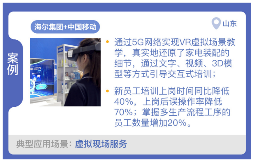 海爾集團與中國移動合作,開展了“5G全連接園區(qū)”項目建設,實現(xiàn)了虛擬現(xiàn)場服務場景的應用。基于算法上云架構,通過5G網(wǎng)絡實現(xiàn)VR內(nèi)容的云端存儲。根據(jù)使用需求下載對應的VR內(nèi)容用于現(xiàn)場教學,真實地還原了家電裝配的細節(jié),通過文字、圖片、聲音、視頻、3D模型等方式引導交互式培訓,幫助培訓人員迅速掌握技術要領,降低了部署成本,解決了新員工培訓上崗時間周期長的問題。自海爾工廠VR員工培訓平臺投入使用以來,新員工培訓上崗時間同比降低40%,上崗后誤操作率降低70%;老員工自主學習時長增加35%,掌握多生產(chǎn)流程工序的產(chǎn)線員工數(shù)量增加20%。