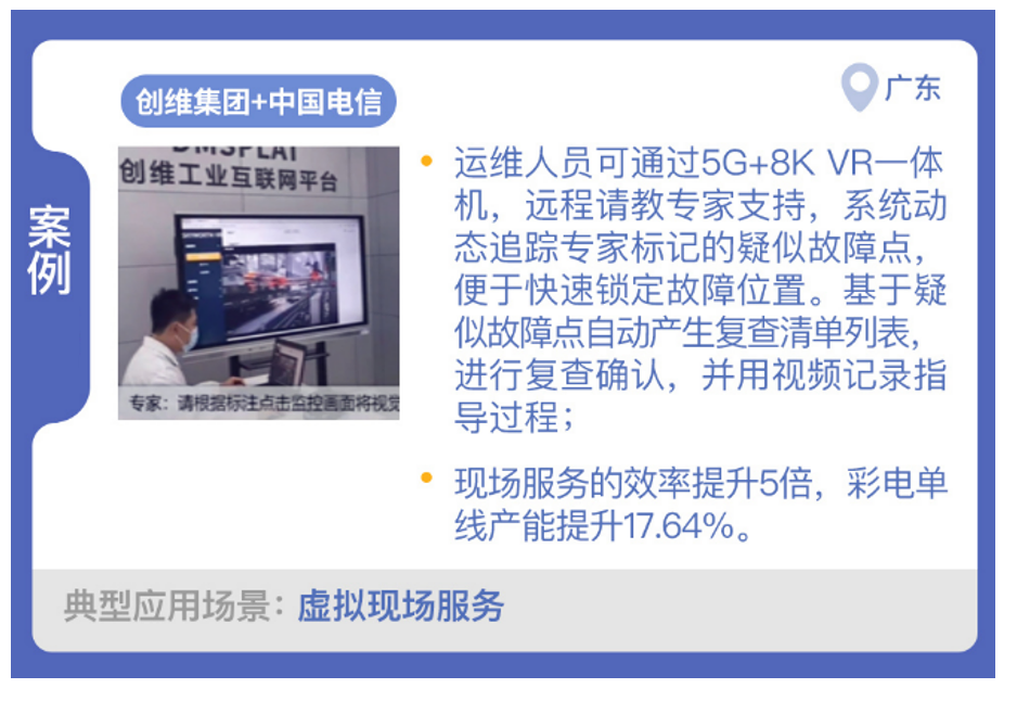 深圳創(chuàng)維-RGB電子集團有限公司與中國電信合作,開展了“5G+8K柔性智能工廠”項目建設,實現(xiàn)了虛擬現(xiàn)場服務場景的應用。利用自主研發(fā)的創(chuàng)維8K VR一體機設備和5G完美融合,形成“云管端”的整體解決方案。遇到問題時,現(xiàn)場運維人員佩戴創(chuàng)維8K VR一體機,根據(jù)系統(tǒng)投射到視野前方的信息獲得可視化指導幫助。信息輔助無法解決問題時,打開遠程專家支持,專家以第一視角畫面清晰獲知現(xiàn)場情況,用紅框標記疑似故障點,實時反饋至VR眼鏡。系統(tǒng)能夠對疑似故障點進行動態(tài)跟蹤,方便運維人員快速鎖定故障位置。通過記錄疑似故障點,自動產(chǎn)生復查清單列表,實現(xiàn)對維修過程關鍵點復查確認。同時,每次遠程指導都以視頻形式進行記錄,用于案例分析或教學使用。通過應用該技術,創(chuàng)維現(xiàn)場服務的效率提升了5倍,彩電單線產(chǎn)能提升17.64%,一線質(zhì)檢員工減少40%,出口提升71.25%。