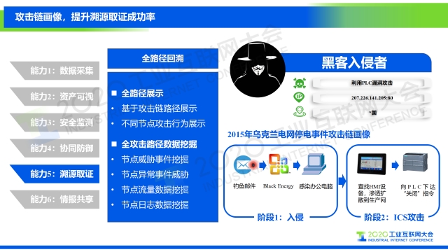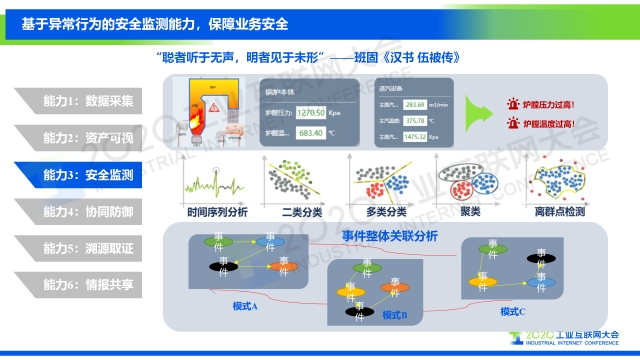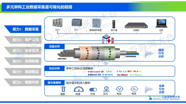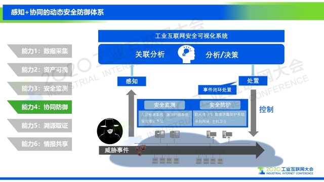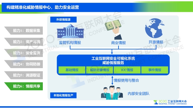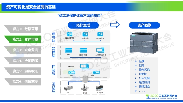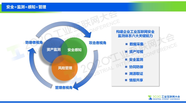 “基于我們對工業互聯網安全框架的解讀,從攻擊者視角、防御者視角和管理者視角三個維度出發,我們提出從資產監測、安全感知、風險管理三個方面實現工業互聯網安全的可視化,以及需要具備的六大關鍵能力,分別是數據采集、資產可視、安全監測、協同防御、溯源取證、情報共享?!?/p>