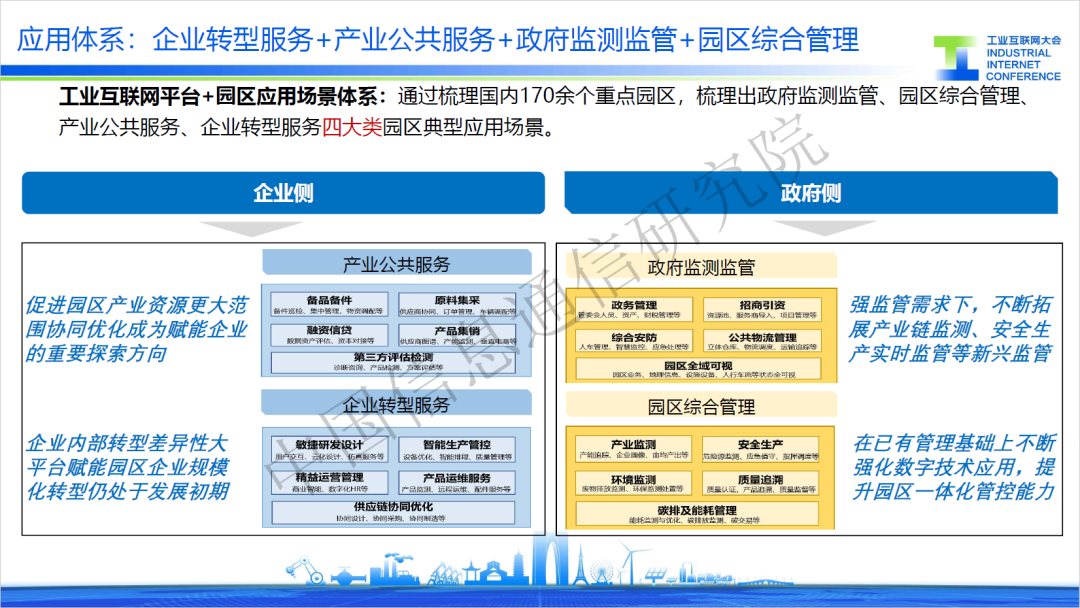 6月15日,2023工業(yè)互聯(lián)網(wǎng)大會在蘇州舉行,在“工業(yè)互聯(lián)網(wǎng)平臺創(chuàng)新發(fā)展”論壇上,中國信通院兩化所工互創(chuàng)新部楊昊亭發(fā)布了《“工業(yè)互聯(lián)網(wǎng)平臺+園區(qū)”典型場景》(以下簡稱“典型場景”)并進行了解讀。園區(qū)作為產(chǎn)業(yè)發(fā)展的主陣地,是推動我國經(jīng)濟發(fā)展的重要引擎。“典型場景”圍繞園區(qū)高質(zhì)量發(fā)展需求,提出了產(chǎn)業(yè)公共服務(wù)、企業(yè)轉(zhuǎn)型服務(wù)、政府監(jiān)測監(jiān)管、園區(qū)綜合管理四類應(yīng)用場景,旨在為提升園區(qū)治理能力與加速產(chǎn)業(yè)轉(zhuǎn)型升級提供可借鑒的經(jīng)驗和模式。