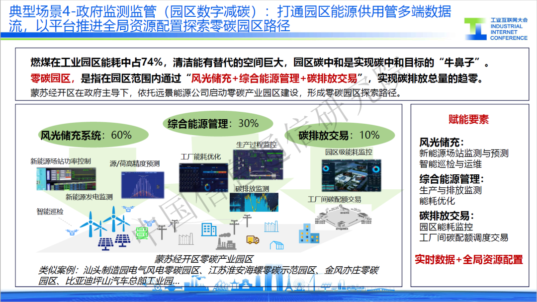四是園區(qū)數(shù)字減碳,某產(chǎn)業(yè)園區(qū)通過“風(fēng)光儲充+綜合能源管理+碳排放交易”實現(xiàn)零碳園區(qū)建設(shè)。在發(fā)電端,通過數(shù)據(jù)建模優(yōu)化,通過新能源發(fā)電監(jiān)測、源網(wǎng)荷儲調(diào)度等方式,優(yōu)化發(fā)電調(diào)度的效率;在用電端,通過工廠能耗優(yōu)化、生產(chǎn)過程管控等方式直接減少生產(chǎn)中的碳排放;在監(jiān)管端,提供碳監(jiān)控、碳核驗、碳交易等服務(wù),實現(xiàn)資源的全局配置。