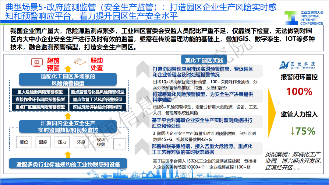 五是安全生產(chǎn)監(jiān)管,針對危險源監(jiān)測點繁多,工業(yè)園區(qū)管委會安監(jiān)人員配比嚴(yán)重不足,線下檢查困難的問題,某服務(wù)商打造化工園區(qū)云平臺,部署超過10000個工業(yè)傳感器,實現(xiàn)園區(qū)內(nèi)液位、溫度、壓力、濃度等數(shù)據(jù)的實時監(jiān)測,同時適配作業(yè)環(huán)節(jié)、廠區(qū)泄露、工藝監(jiān)管的模型,實現(xiàn)園區(qū)預(yù)警與處置。