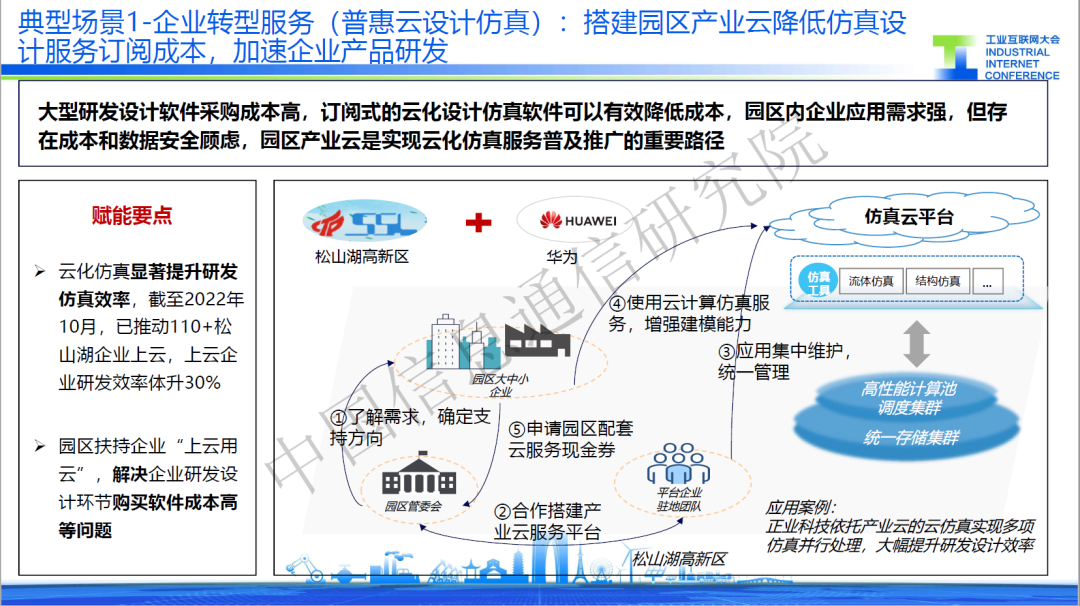 “典型場景”一是普惠云設(shè)計仿真,針對中小企業(yè)研發(fā)工具成本高的問題,某服務(wù)商通過建立仿真云平臺,一方面提供低成本的仿真工具,并基于平臺實現(xiàn)統(tǒng)一版本管理,降低企業(yè)使用成本。另一方面,打造高性能計算與存儲管理設(shè)施,為仿真工具提供算力支撐。目前,該應(yīng)用已覆蓋110家中小企業(yè),實現(xiàn)研發(fā)效率提升30%。