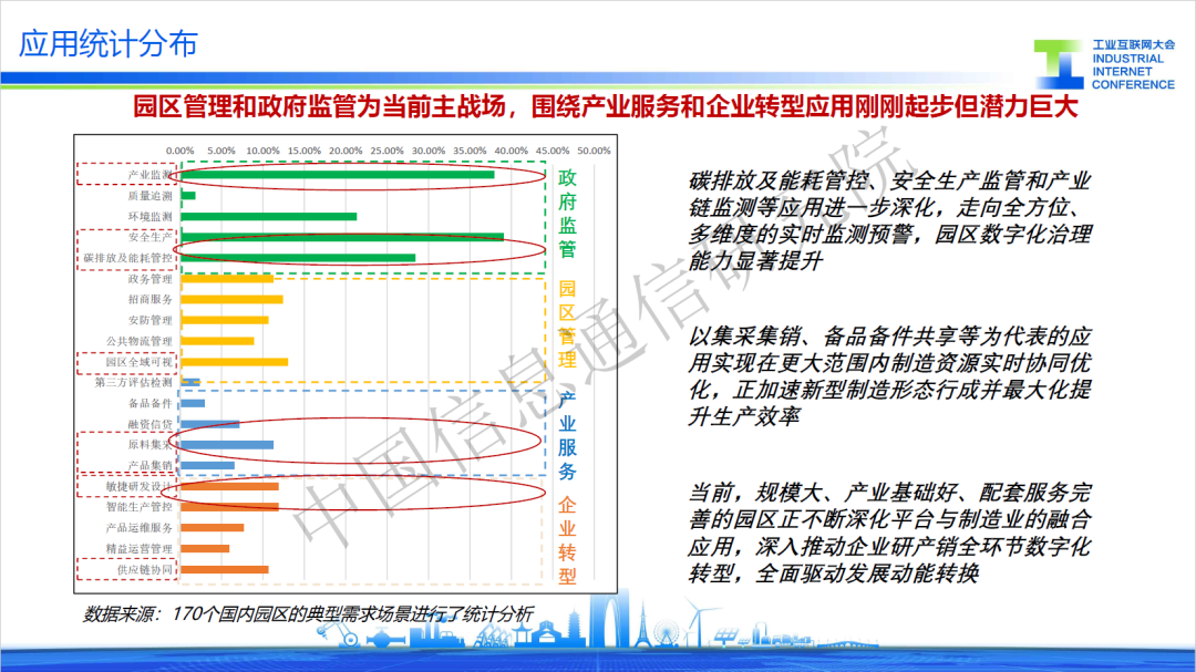 從應(yīng)用類型來看,“工業(yè)互聯(lián)網(wǎng)平臺+園區(qū)”形成了產(chǎn)業(yè)公共服務(wù)、企業(yè)轉(zhuǎn)型服務(wù)、政府監(jiān)測監(jiān)管、園區(qū)綜合管理四類典型應(yīng)用。從應(yīng)用數(shù)量來看,政府監(jiān)測監(jiān)管與園區(qū)綜合管理滿足政府精準(zhǔn)施策的需求,是園區(qū)應(yīng)用的重點,占比分別為48.9%和21.4%;企業(yè)轉(zhuǎn)型服務(wù)在產(chǎn)業(yè)基礎(chǔ)好的園區(qū)發(fā)展迅速,應(yīng)用占比為18.2%;產(chǎn)業(yè)公共服務(wù)整體處于起步階段,應(yīng)用占比為11.5%。