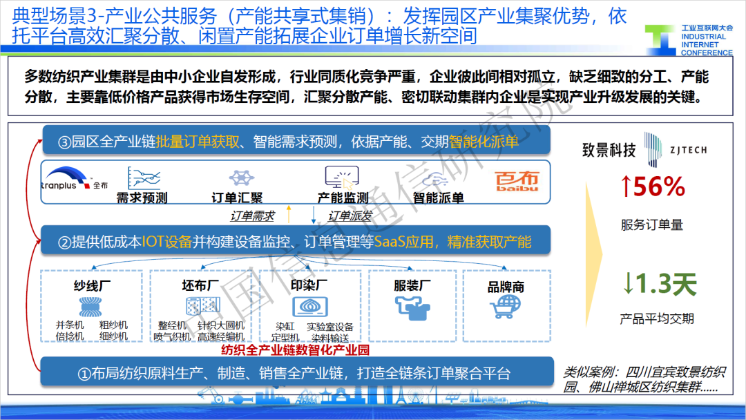三是產(chǎn)能共享式集銷,紡織企業(yè)同質(zhì)化競爭嚴(yán)重,缺乏細(xì)致的分工、產(chǎn)能分散,主要靠低價格產(chǎn)品獲得市場生存空間。某服務(wù)商針對紡織企業(yè)痛點打造集采集銷平臺,將訂單需求與企業(yè)生產(chǎn)拉通,通過智能化派單優(yōu)化提高資源配置效率,應(yīng)用過程中有效提升企業(yè)訂單數(shù)量56%。