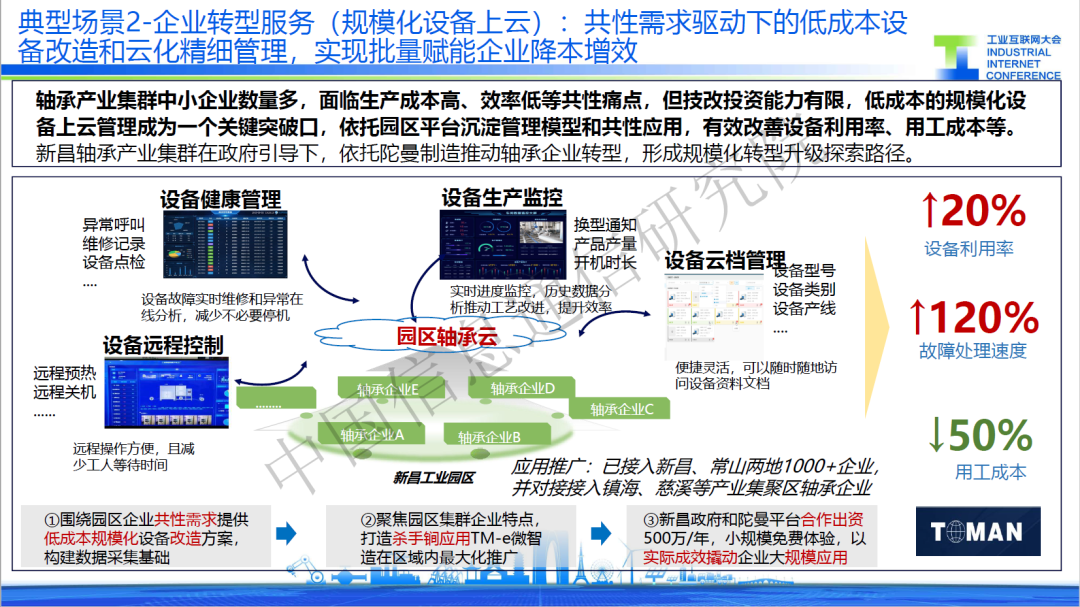 二是規(guī)模化設(shè)備上云,針對面向軸承產(chǎn)業(yè)集群中小企業(yè)數(shù)量多,設(shè)備停機率高的共性痛點,某服務(wù)商打造園區(qū)軸承云,提供設(shè)備遠(yuǎn)程控制、設(shè)備健康管理、設(shè)備生產(chǎn)監(jiān)控等一系列殺手锏應(yīng)用,通過對設(shè)備的管控有效減少停機時間,使得軸承行業(yè)綜合成本較改造前下降12%,利潤率也從改造前的4%提升到了8%。