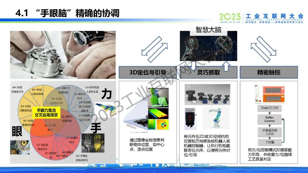 林杰分享智能制造產(chǎn)業(yè)趨勢和特征,指出了傳統(tǒng)制造型企業(yè)“智改數(shù)轉(zhuǎn)”的痛點(diǎn),提出要為制造配上“慧眼”。他表示人工智能的飛速發(fā)展,為工業(yè)發(fā)展插上翅膀,通過“手眼腦”精確的協(xié)調(diào)和執(zhí)行來解決問題。