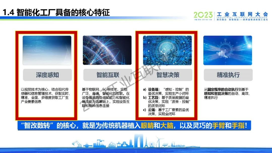 未來智能化工廠具備以下四個特征:深度感知,智能互聯(lián),智慧決策和精準(zhǔn)執(zhí)行。“智改數(shù)轉(zhuǎn)”的核心,就是為傳統(tǒng)機(jī)器植入眼睛和大腦,以及靈巧的手臂和手指!