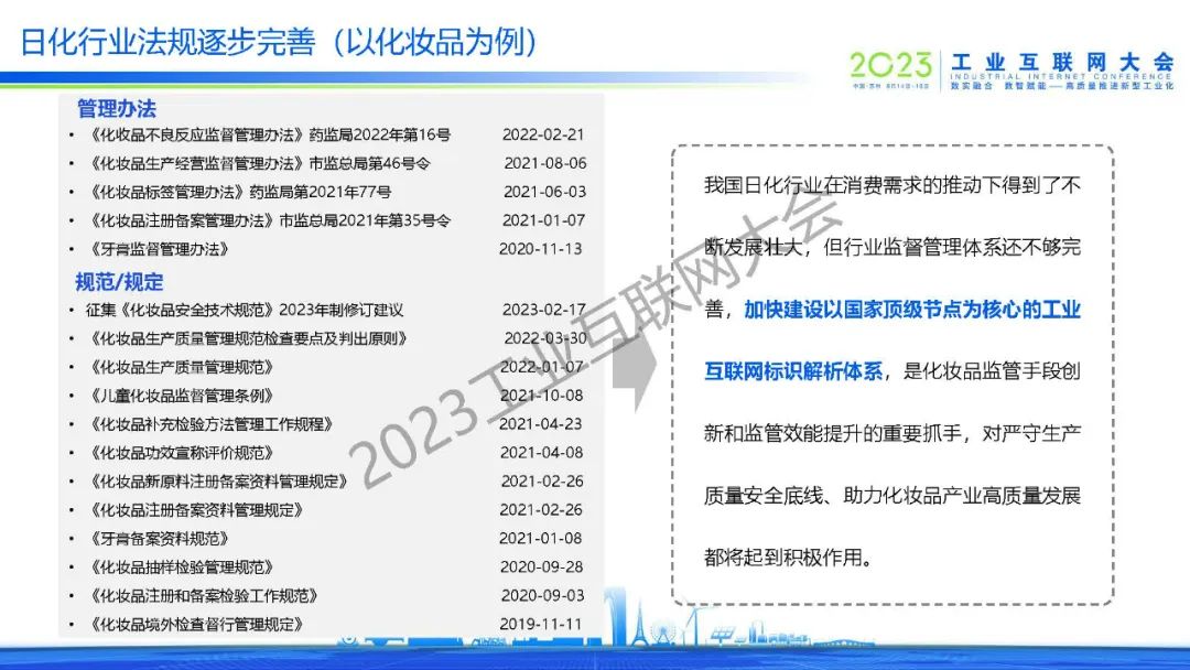 趙鵬飛表示,我國(guó)日化行業(yè)在消費(fèi)需求的推動(dòng)下得到了不斷發(fā)展壯大,但行業(yè)監(jiān)督管理體系還不夠完善,加快建設(shè)以國(guó)家頂級(jí)節(jié)點(diǎn)為核心的工業(yè)互聯(lián)網(wǎng)標(biāo)識(shí)解析體系,是日化產(chǎn)品監(jiān)管手段創(chuàng)新和監(jiān)管效能提升的重要抓手,對(duì)嚴(yán)守生產(chǎn)質(zhì)量安全底線(xiàn)、助力化妝品產(chǎn)業(yè)高質(zhì)量發(fā)展都將起到積極作用。