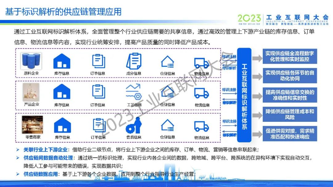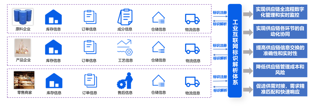 通過(guò)工業(yè)互聯(lián)網(wǎng)標(biāo)識(shí)解析體系,全面管理整個(gè)行業(yè)供應(yīng)鏈需要的共享信息,高效管理上下游產(chǎn)業(yè)鏈的庫(kù)存信息、訂單信息、物流信息等內(nèi)容,實(shí)現(xiàn)行業(yè)統(tǒng)籌安排,提高產(chǎn)品質(zhì)量的同時(shí)降低產(chǎn)品成本。實(shí)現(xiàn)行業(yè)上下游企業(yè)關(guān)聯(lián):借助行業(yè)二級(jí)節(jié)點(diǎn),將行業(yè)上下游企業(yè)之間的庫(kù)存、訂單、物流、營(yíng)銷(xiāo)等信息串聯(lián)起來(lái);實(shí)現(xiàn)供應(yīng)鏈間數(shù)據(jù)自動(dòng)處理:通過(guò)統(tǒng)一的標(biāo)識(shí)處理,行業(yè)內(nèi)各企業(yè)間的數(shù)據(jù),跨地域、跨平臺(tái)、跨系統(tǒng)的在異構(gòu)環(huán)境下實(shí)現(xiàn)自動(dòng)交互,降低人工參與可能帶來(lái)的錯(cuò)誤,實(shí)現(xiàn)數(shù)據(jù)共識(shí);實(shí)現(xiàn)供應(yīng)鏈數(shù)據(jù)應(yīng)用:基于上下游各個(gè)企業(yè)數(shù)據(jù),應(yīng)用到整個(gè)行業(yè)指導(dǎo)行業(yè)生產(chǎn)經(jīng)營(yíng)。
