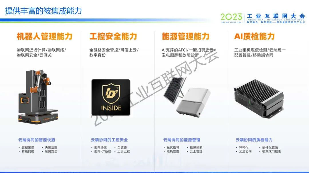 平臺面向單個設備、單條產線、多工廠多基地三個場景,提供設備級物聯運維、產線級生產監控、多工廠多基地的制造協同平臺等標準產品服務,同時提供云邊協同的機器人管理能力、工控安全能力、能源管理能力、AI質檢能力等,讓用戶按需選擇靈活集成到自有系統中。