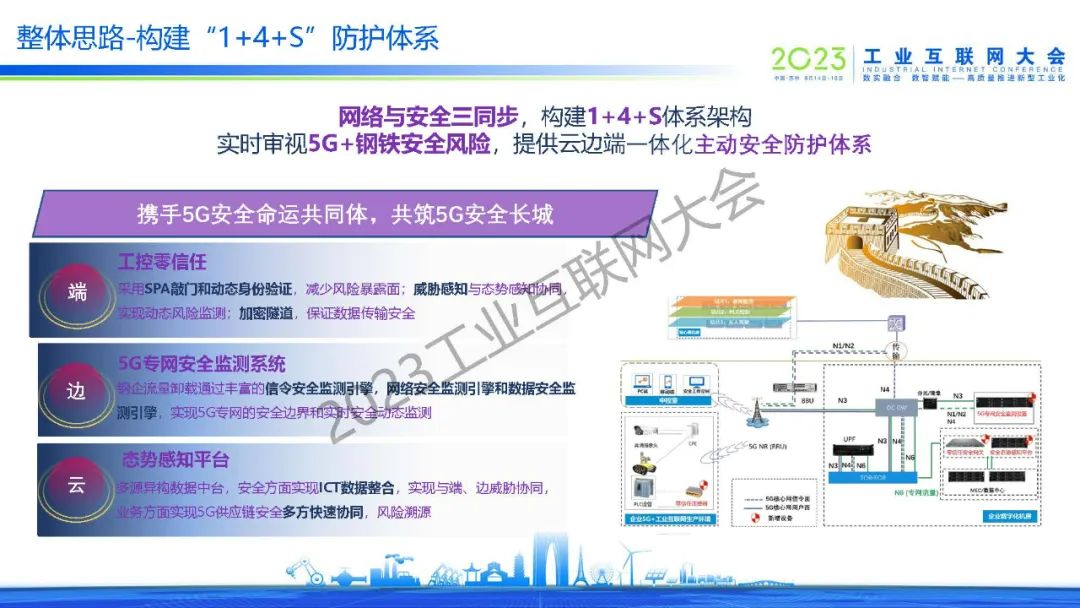 林飛指出,5G作為“新基建”七大領(lǐng)域之首,推動和支撐邊緣計算、云計算、大數(shù)據(jù)、人工智能、工業(yè)互聯(lián)網(wǎng)、數(shù)字孿生等新一代信息技術(shù)在鋼鐵企業(yè)落地生根,賦能鋼鐵行業(yè)數(shù)字化、智能化轉(zhuǎn)型發(fā)展。當(dāng)前,鋼鐵5G專網(wǎng)面臨多種安全威脅,需要建立起網(wǎng)絡(luò)與安全三同步的規(guī)劃,構(gòu)建“1+4+S”體系架構(gòu),從云、邊、端一體化建立起主動安全防護的體系。
