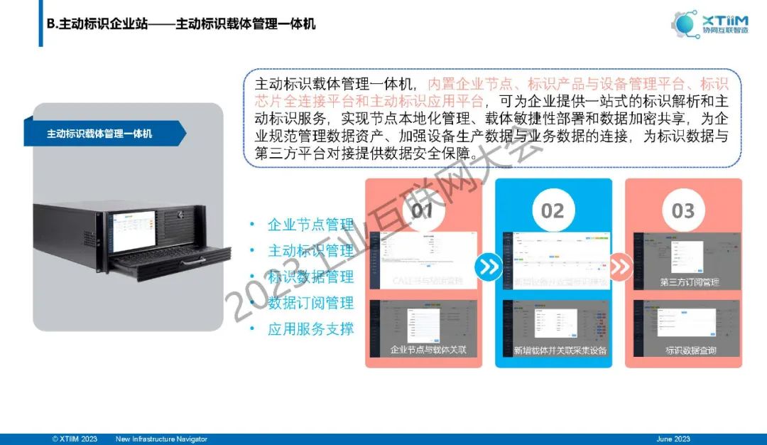 “主動標識載體管理一體機,內置企業節點、標識產品與設備管理平臺、標識芯片全連接平臺和主動標識應用平臺,可為企業提供一站式的標識解析和主動標識服務,實現節點本地化管理、載體敏捷性部署和數據加密共享,為企業規范管理數據資產、加強設備生產數據與業務數據的連接,為標識數據與第三方平臺對接提供數據安全保障?!?/p>