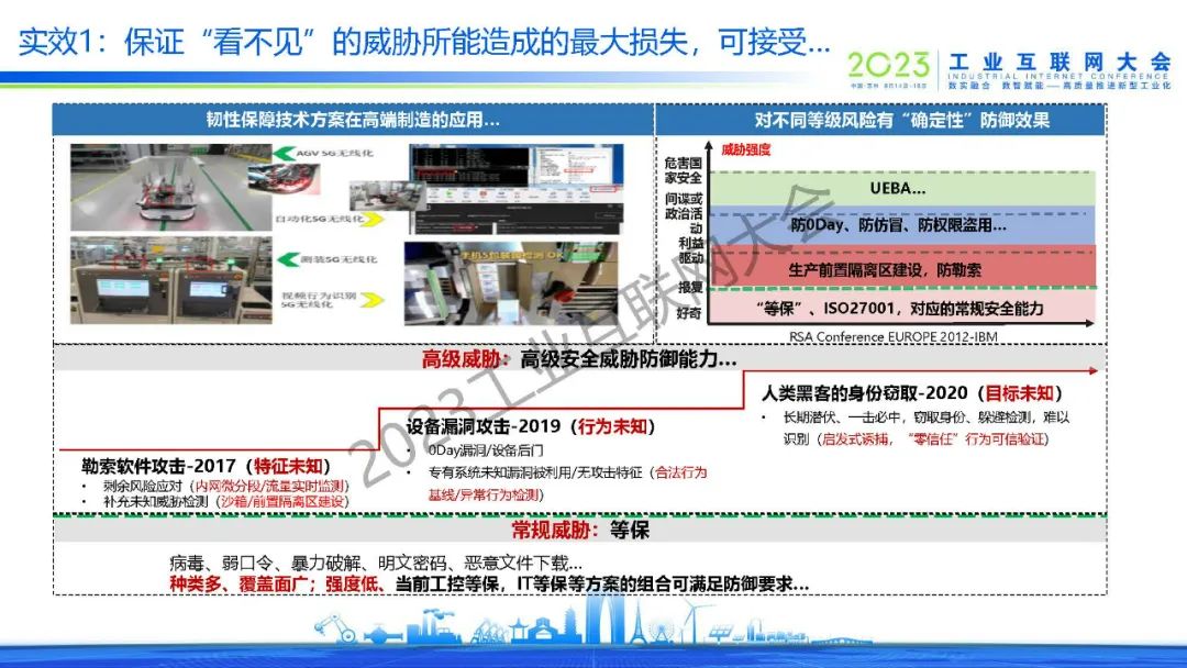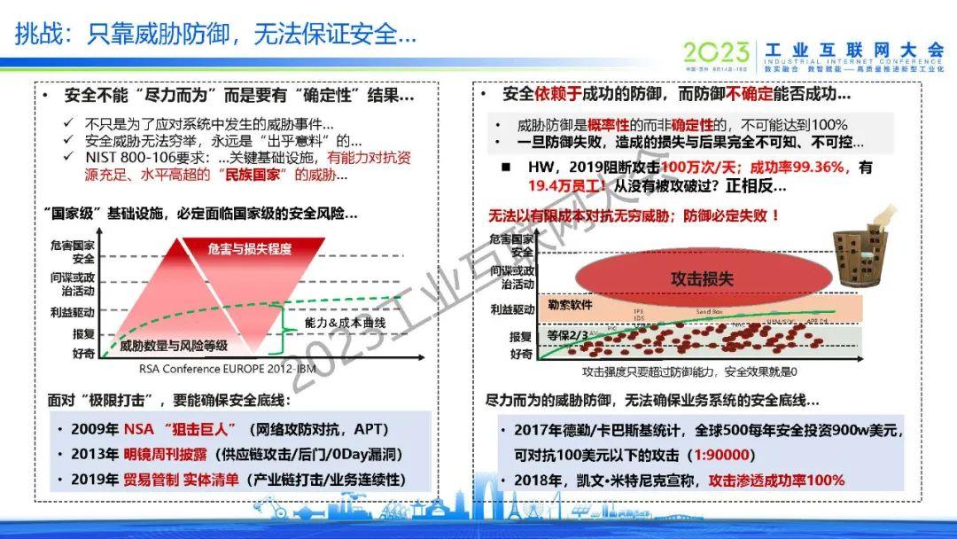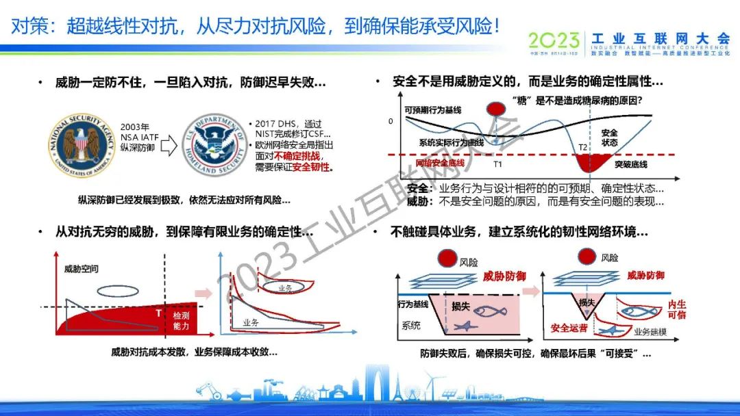 王雨晨指出,安全是產(chǎn)業(yè)數(shù)字化轉(zhuǎn)型中的“馬六甲海峽”,越有價(jià)值的系統(tǒng),面臨的安全風(fēng)險(xiǎn)越大。對(duì)抗策略也需要超越線性對(duì)抗,從盡力對(duì)抗風(fēng)險(xiǎn),到確保能承受風(fēng)險(xiǎn)。建立可信網(wǎng)絡(luò):從一維線性的威脅防御,到三維系統(tǒng)性的安全保障,前置隔離區(qū)爭取最好情況,內(nèi)網(wǎng)微隔離確保最壞結(jié)果可接受,運(yùn)營管理區(qū)實(shí)現(xiàn)動(dòng)態(tài)安全。