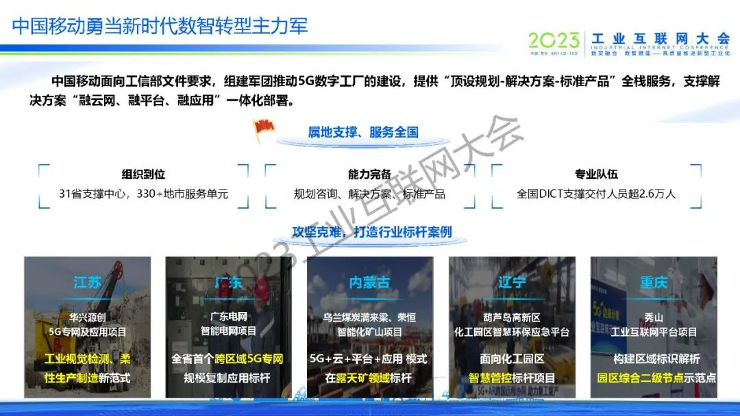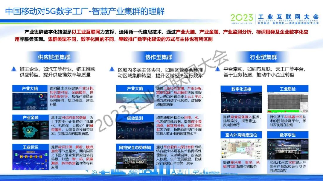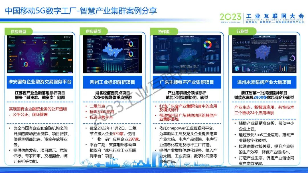 陳豫蓉表示,中國移動組建軍團推動5G數(shù)字工廠的建設(shè),提供“頂設(shè)規(guī)劃-解決方案-標準產(chǎn)品”全棧服務(wù),支撐解決方案“融云網(wǎng)、融平臺、融應(yīng)用”一體化部署。她介紹到,產(chǎn)業(yè)集群數(shù)字化轉(zhuǎn)型是以工業(yè)互聯(lián)網(wǎng)為支撐,運用新一代信息技術(shù),通過產(chǎn)業(yè)大腦、產(chǎn)業(yè)金融、產(chǎn)業(yè)監(jiān)測分析、標識服務(wù)及企業(yè)數(shù)字化應(yīng)用等服務(wù)實現(xiàn)。集群類型不同,數(shù)字化目的不同,導(dǎo)致推廣數(shù)字化建設(shè)的方式與主體也有所區(qū)別。