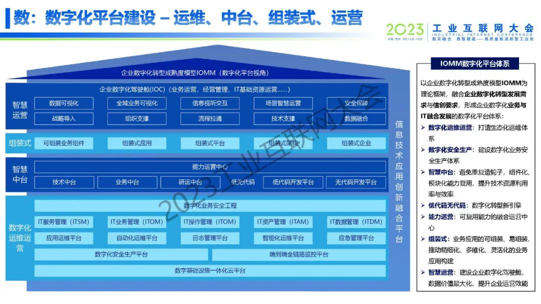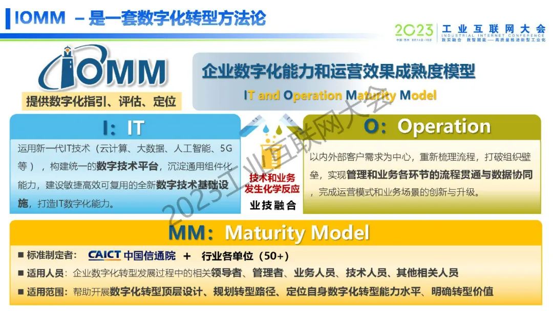 6月14日,在2023工業(yè)互聯(lián)網(wǎng)大會(huì)“工業(yè)互聯(lián)網(wǎng)助力企業(yè)數(shù)字化轉(zhuǎn)型高端論壇”上,中國(guó)信息通信研究院云計(jì)算與大數(shù)據(jù)研究所副所長(zhǎng)栗蔚發(fā)表了《企業(yè)數(shù)字化能力和運(yùn)營(yíng)效果成熟度模型IOMM 2.0發(fā)布與解讀》的主題演講。