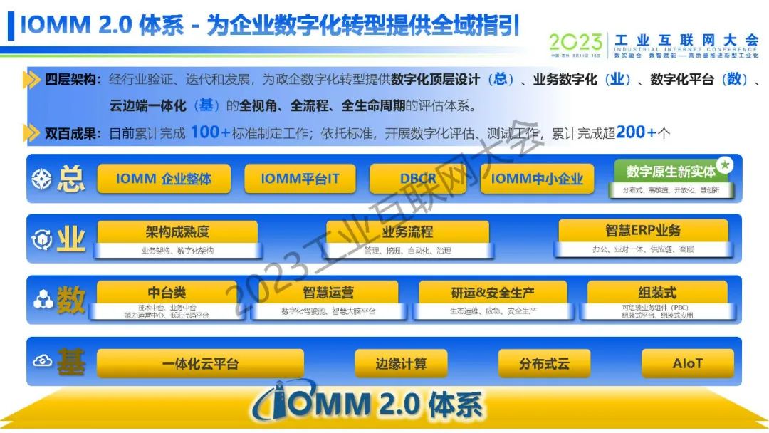 栗蔚表示,我國(guó)已基本形成完善的數(shù)字經(jīng)濟(jì)頂層設(shè)計(jì)與細(xì)化的行業(yè)推進(jìn)舉措相結(jié)合的政策體系。數(shù)字經(jīng)濟(jì)政策部署已經(jīng)成為我國(guó)構(gòu)建現(xiàn)代化產(chǎn)業(yè)、市場(chǎng)、治理體系的重要組成,成為推進(jìn)中國(guó)式現(xiàn)代化的重要驅(qū)動(dòng)。IOMM2.0體系是一套數(shù)字化轉(zhuǎn)型方法論,將為企業(yè)數(shù)字化轉(zhuǎn)型提供全域指引。