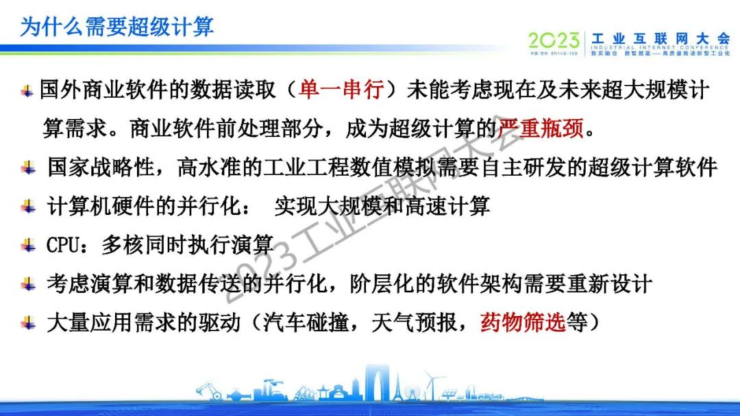 董勤喜指出,超級計算是解決國家經濟建設、社會發展、科學進步、國家安全和國防建設等領域一系列重大挑戰性問題的重要手段。目前主要應用于“高、精、尖”的前沿科學和工程研究。目前,國外商業軟件的數據讀?。▎我淮校┪茨芸紤]現在及未來超大規模計算需求。商業軟件前處理部分,成為超級計算的嚴重瓶頸。國家戰略性,高水準的工業工程數值模擬需要自主研發的超級計算軟件,實行大規模的高速計算。