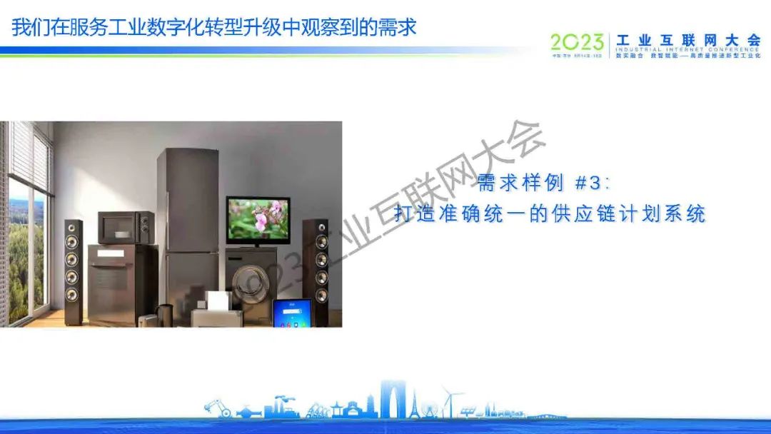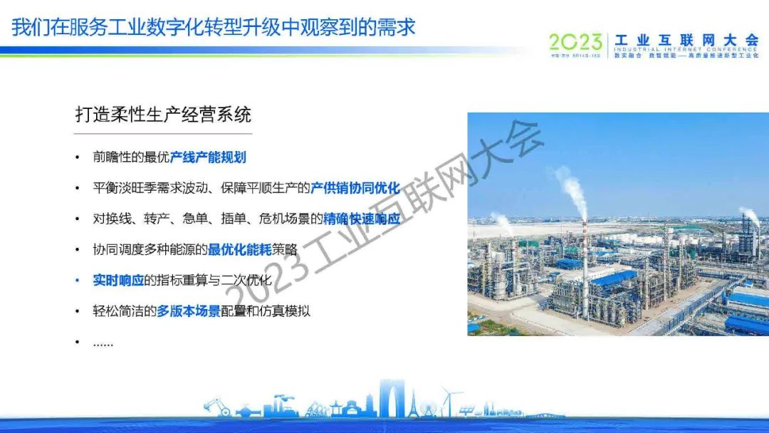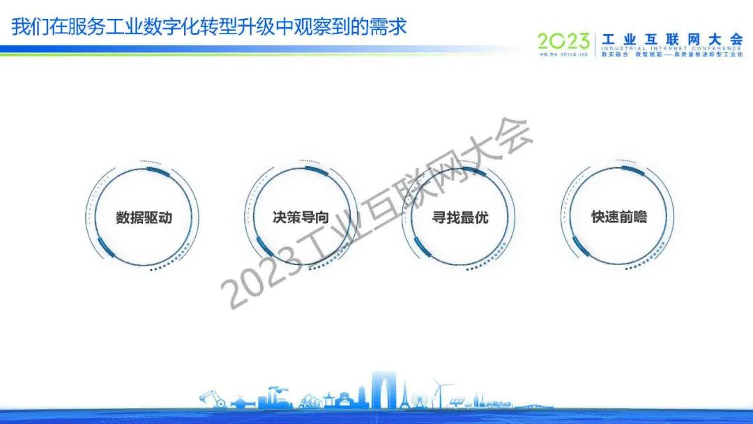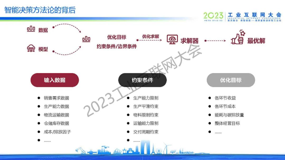 王曦分享了裝備、化工和耐用消費品的三個需求樣例,提出了在服務工業數字化轉型升級中觀察到的四大需求:數據驅動、決策導向、尋找最優和快速前瞻。智能決策方法論是通過輸入數據和模型,在優化目標和約束條件(邊界條件)下優化求解出最優解。