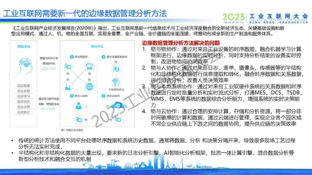 于辰濤指出,工業互聯網需要新一代的邊緣數據管理分析方法,半結構化和非結構化數據的大量出現,要求新的日志分析引擎,AI智能化分析框架,批流一體計算引擎,混合數據分析等新型分析技術和融合交互的機制?;ヂ摼W廠商、通信運營商、工業軟件與服務提供商和IT服務提供商將邊緣計算作為邊緣數據管理與分析的主要框架,融合大數據、物聯網、區塊鏈、人工智能等技術,共同推動了邊緣計算演進發展。