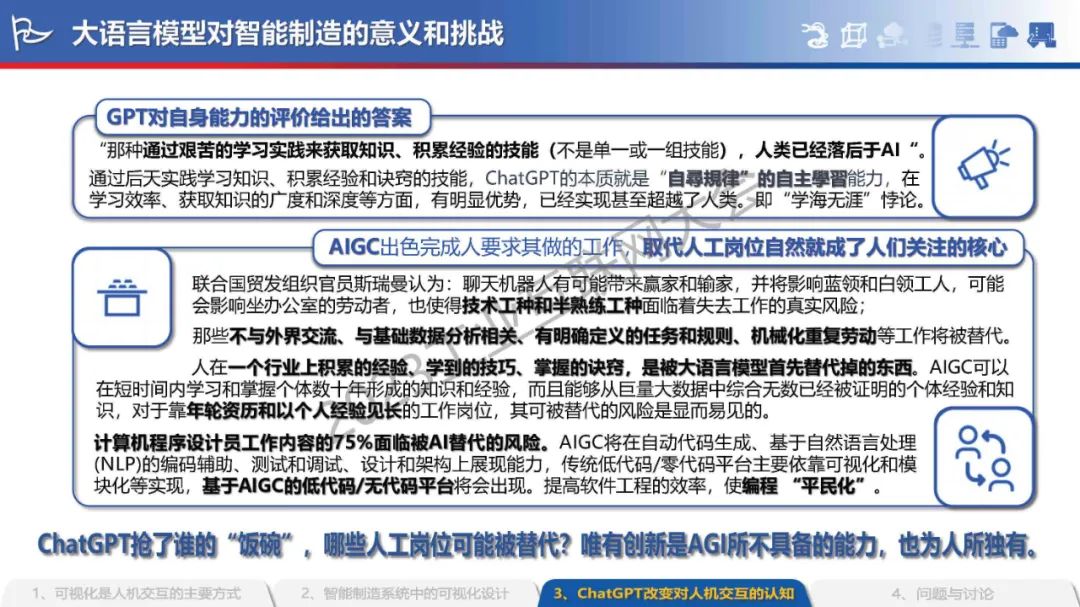 他表示,目前的人機交互功能都是遵循機器語言設計,這不僅技術門檻高,且效率低下。需要開發其他技術滿足需求。與人類自如交互的多模態大模型已經達到了謹慎可用程度,意味著人機交互又新增了一個新賽道道、新手段、新模式。通用人工智能進入智能制造過程,包括即時知識支撐、操業導航、基礎材料匯聚、多源信息整合、決策支持建議等,甚至及時發出控制動作指令。